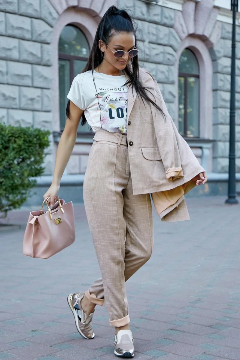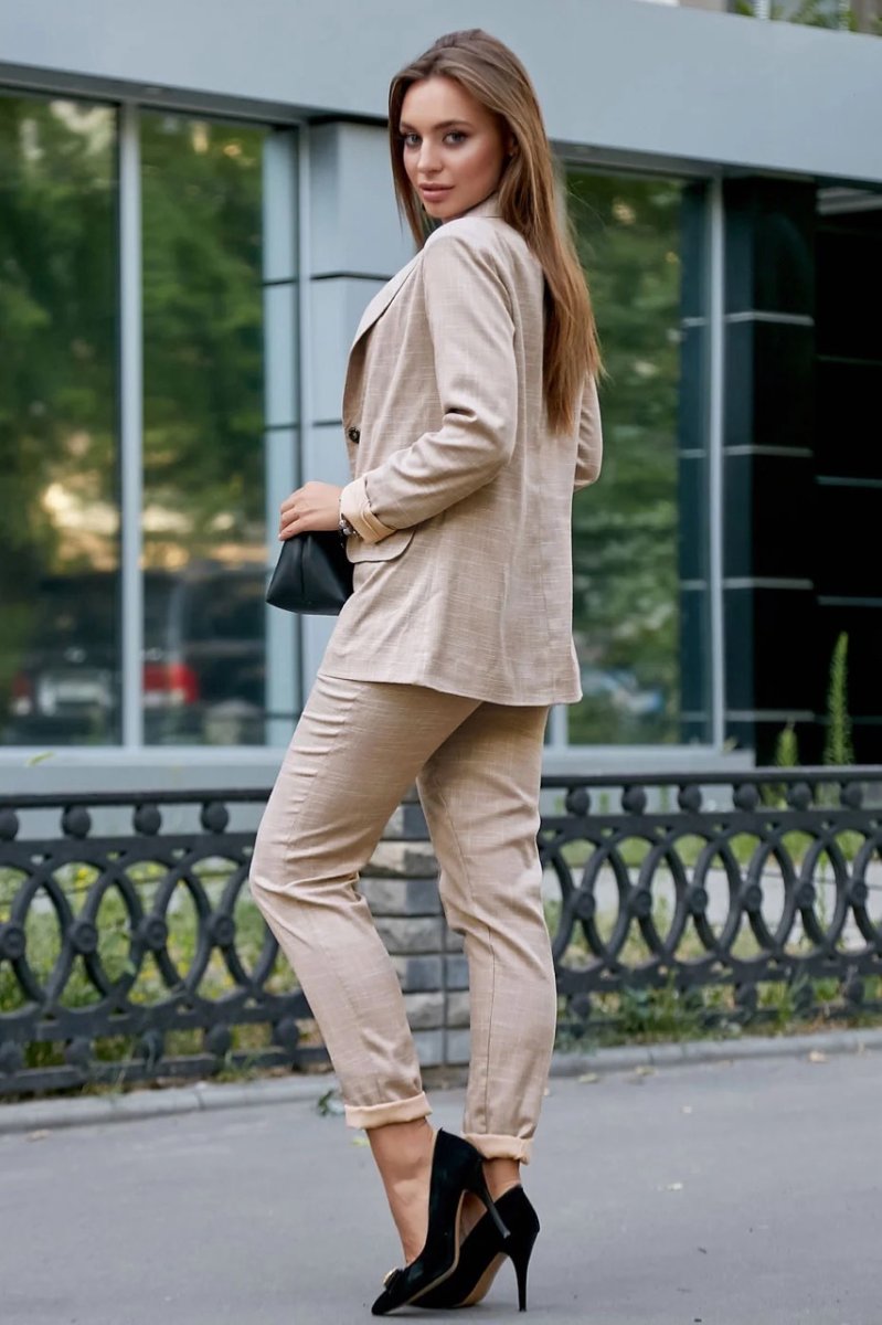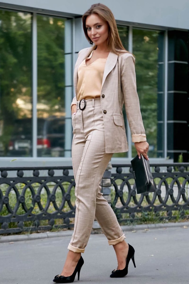 Элегантный женский костюм. Сшит из высококачественного материала натуральный лен - изделия подарят необыкновенное чувство комфорта. Брюки прямого кроя с высокой посадкой подчеркнут линию талии и будут замечательно смотреться с майками и футболками заправленными внутрь. Пиджак (жакет) отменно завершит лук будучи хорошим помощником при первой прохладе. Дизайнерский подбор цветов, в этот раз кофейный, объясняется универсализацией вашего гардероба, а съемный пояс закончит образ С такой палитрой не стоит бояться совмещать, все что пожелает сезон и настроение.