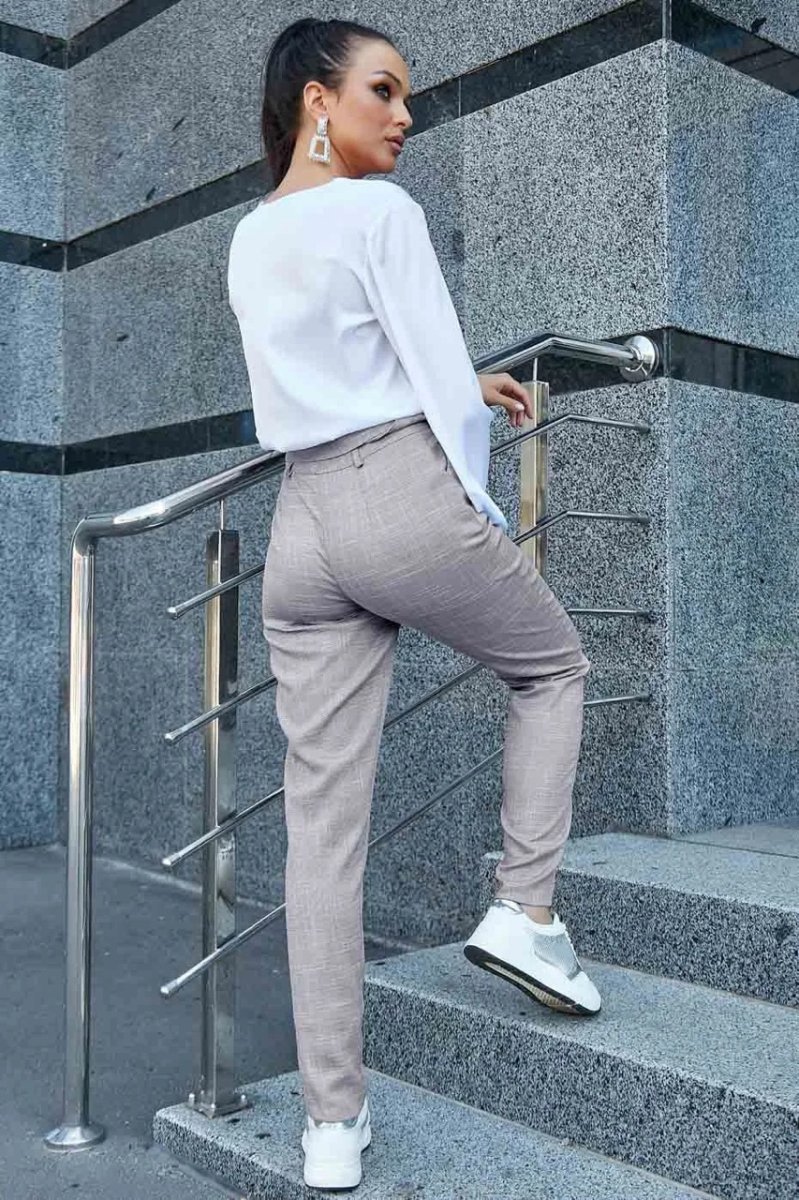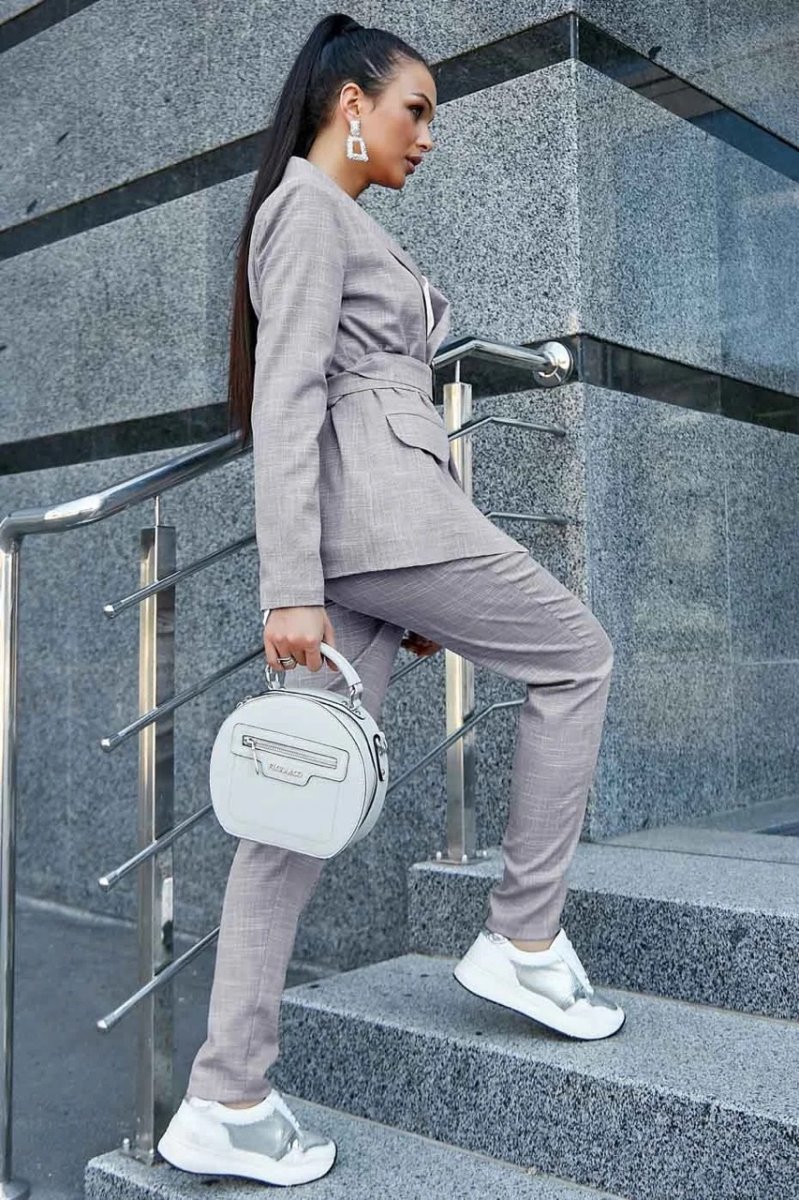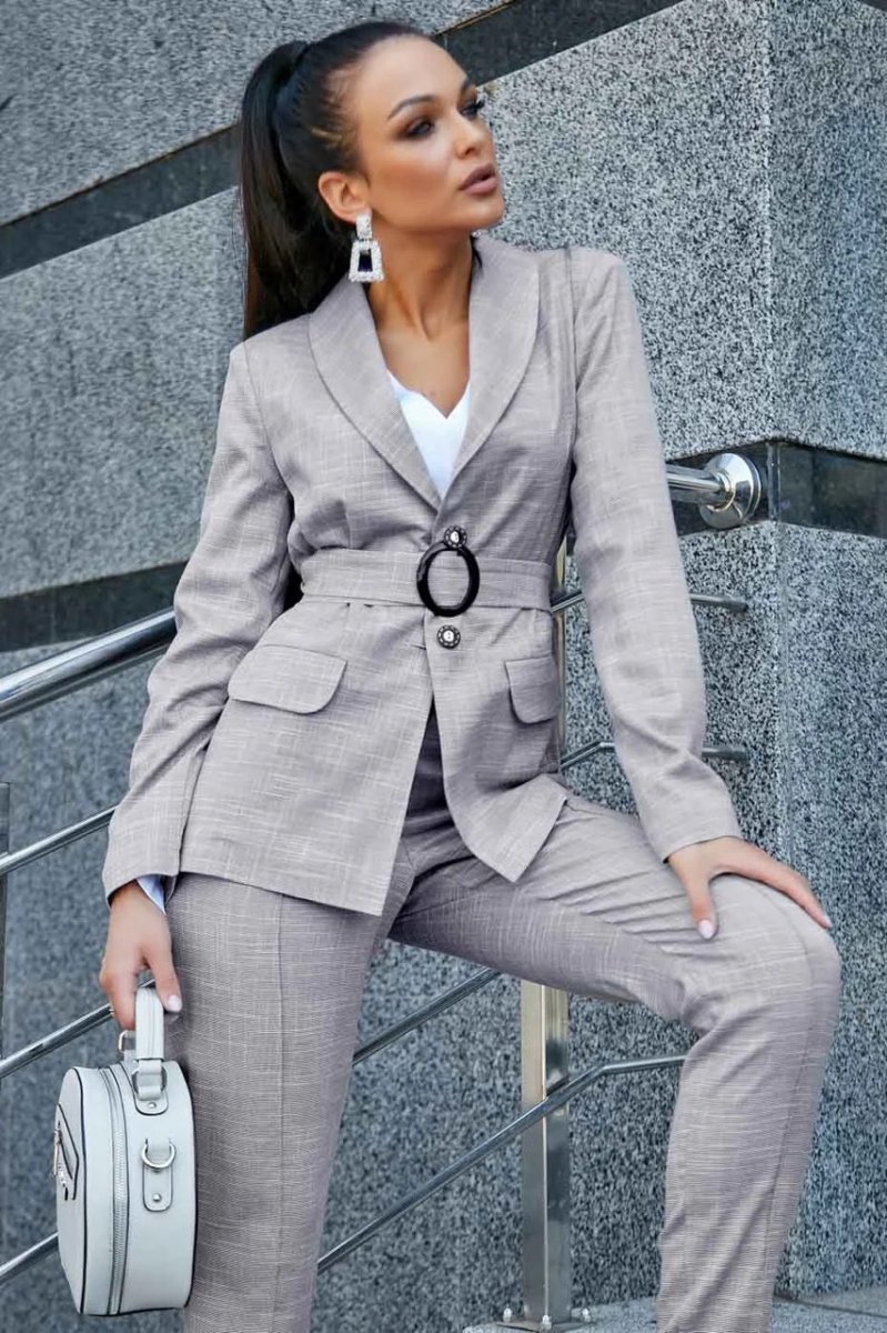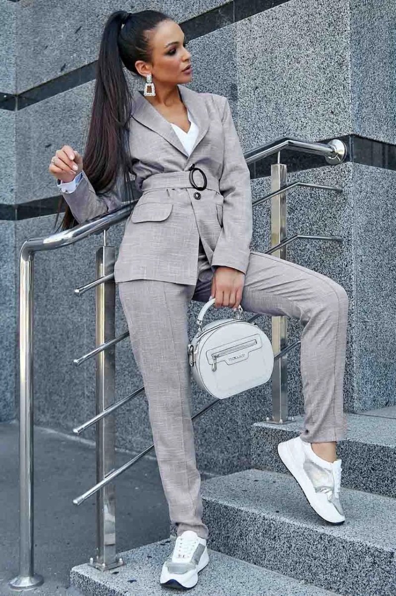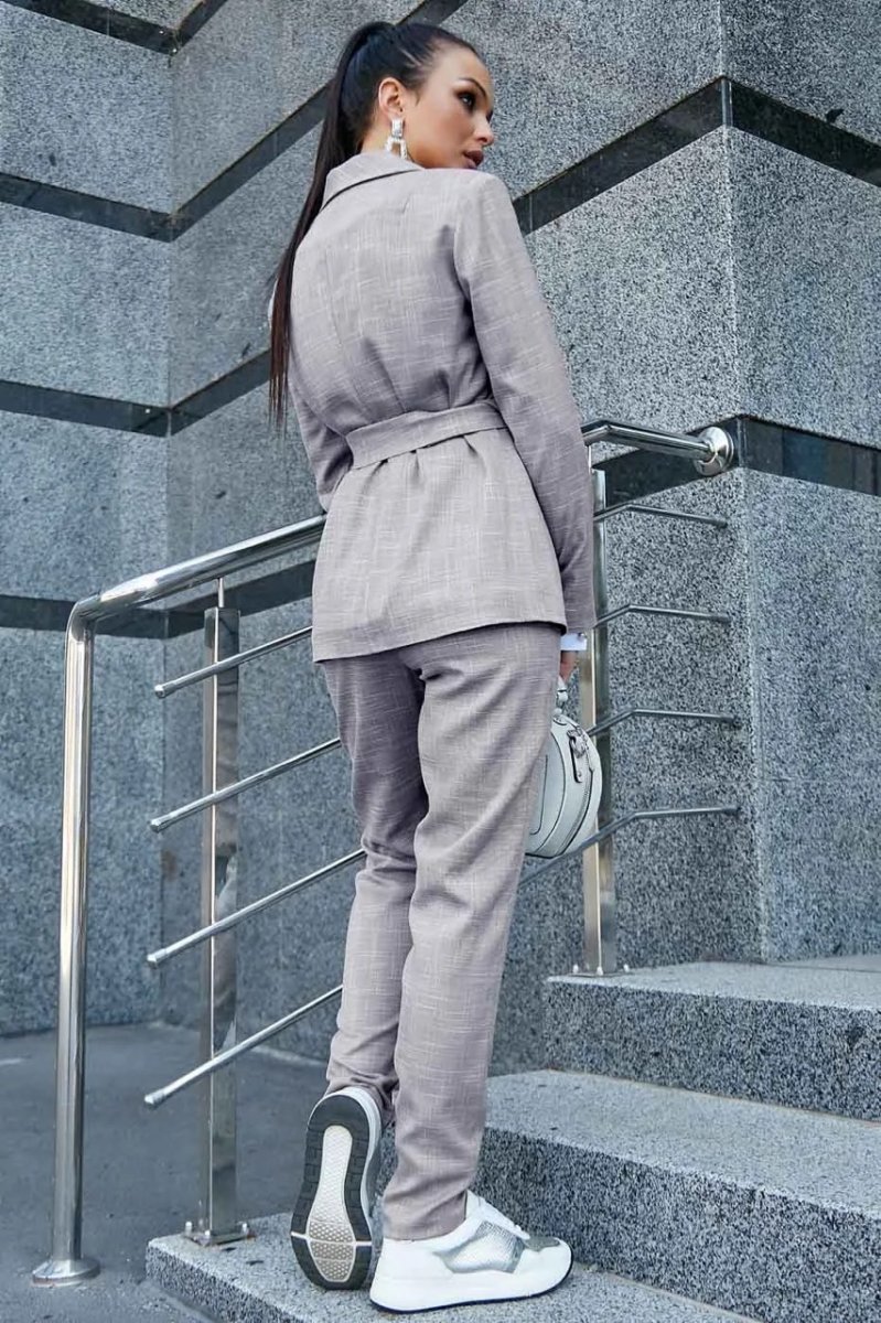 Элегантный женский костюм. Сшит из высококачественного материала натуральный лен - изделия подарят необыкновенное чувство комфорта. Брюки прямого кроя с высокой посадкой подчеркнут линию талии и будут замечательно смотреться с майками и футболками заправленными внутрь. Пиджак (жакет) отменно завершит лук будучи хорошим помощником при первой прохладе. Дизайнерский подбор цветов, в этот раз кофейный, объясняется универсализацией вашего гардероба, а съемный пояс закончит образ С такой палитрой не стоит бояться совмещать, все что пожелает сезон и настроение.