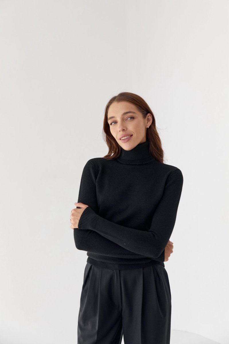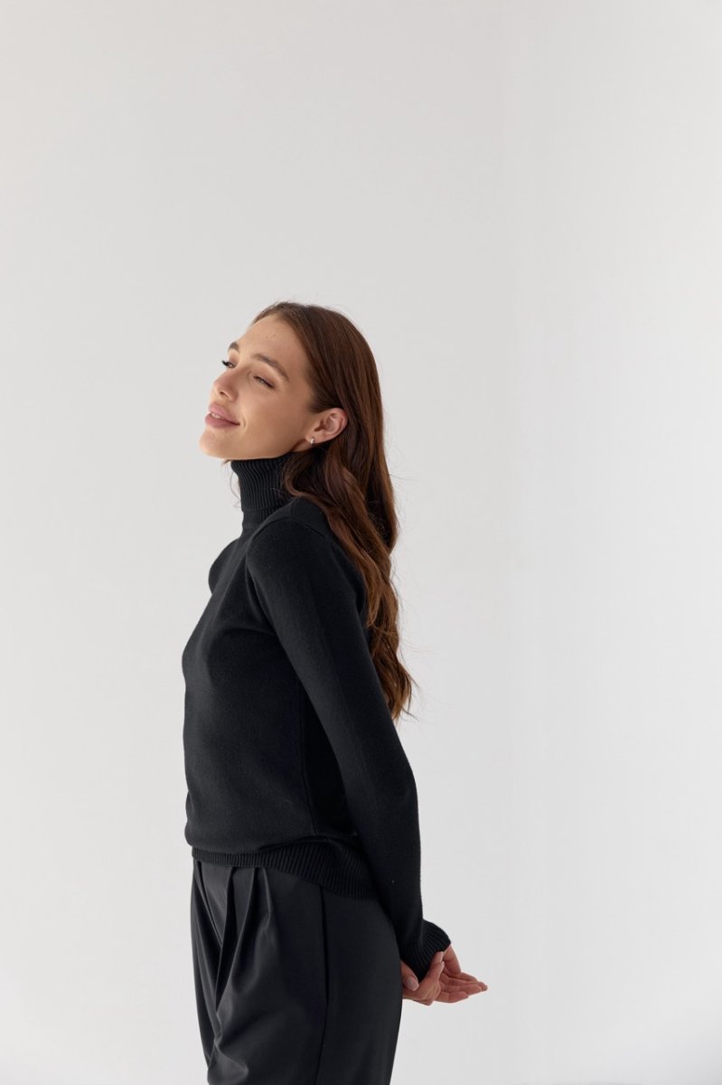 Трикотажный теплый гольф с круглой горловиной, высота вортника-стойки 15 см. Рукава втачные, длинные. По низу изделия и рукавов: манжет-резинка.