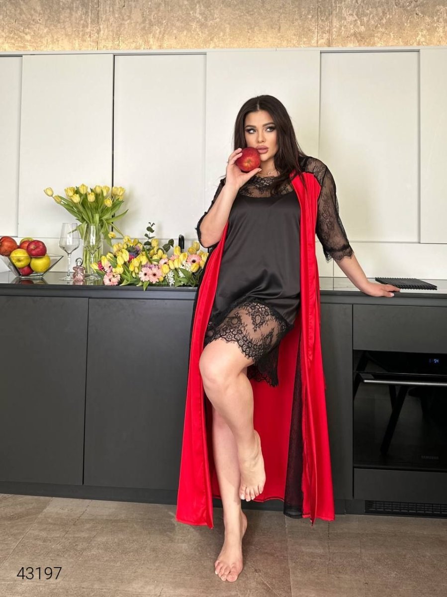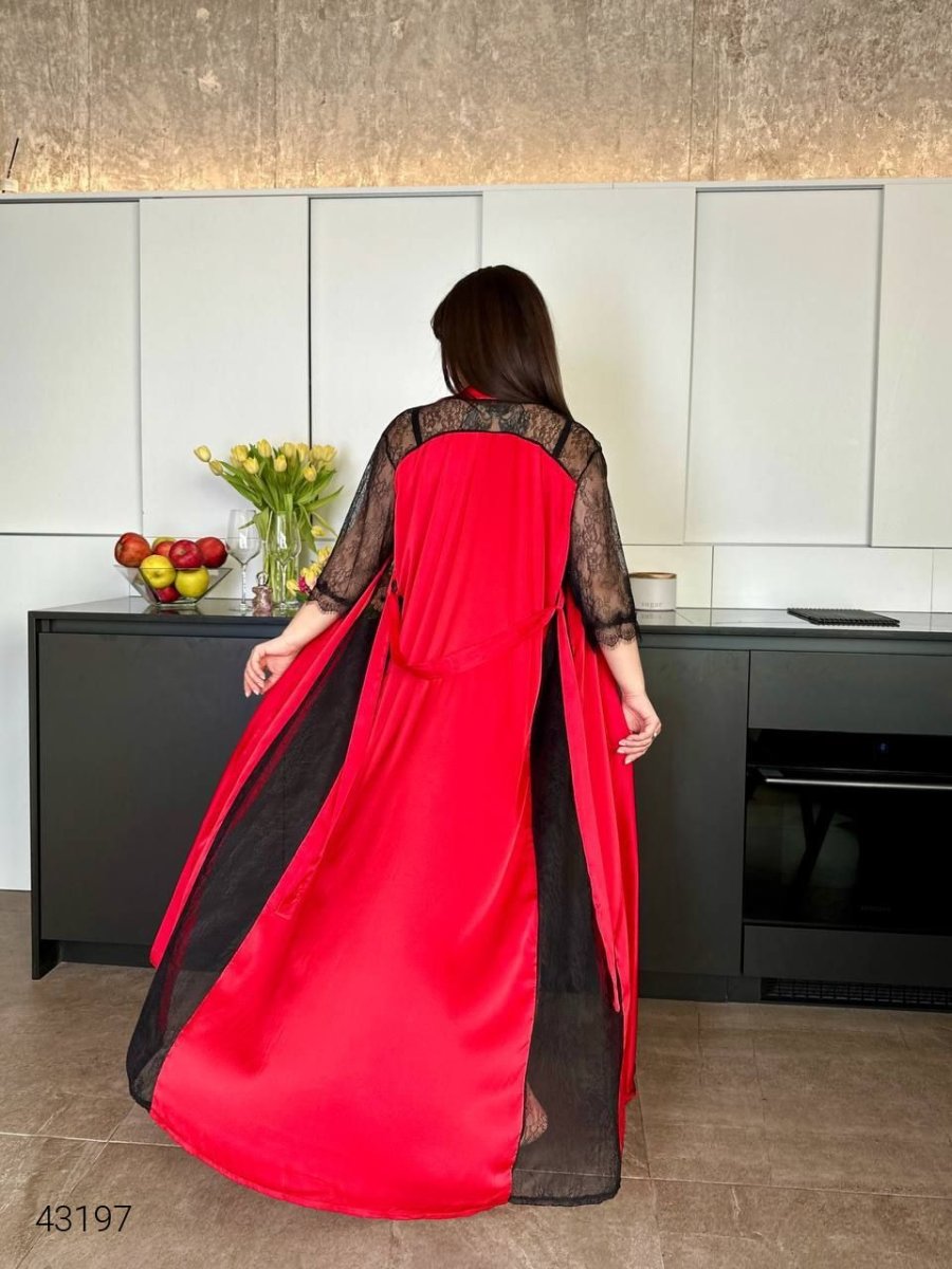 Халат женский шелковый с кружевом. Расширенный по низу со вставками вдоль всего халата по бокам. Кружевные рукава, пояс в комплекте. Ткань: шелк армани, не тянется. Состав: Полиэстер – 95%, Хлопок – 5%.