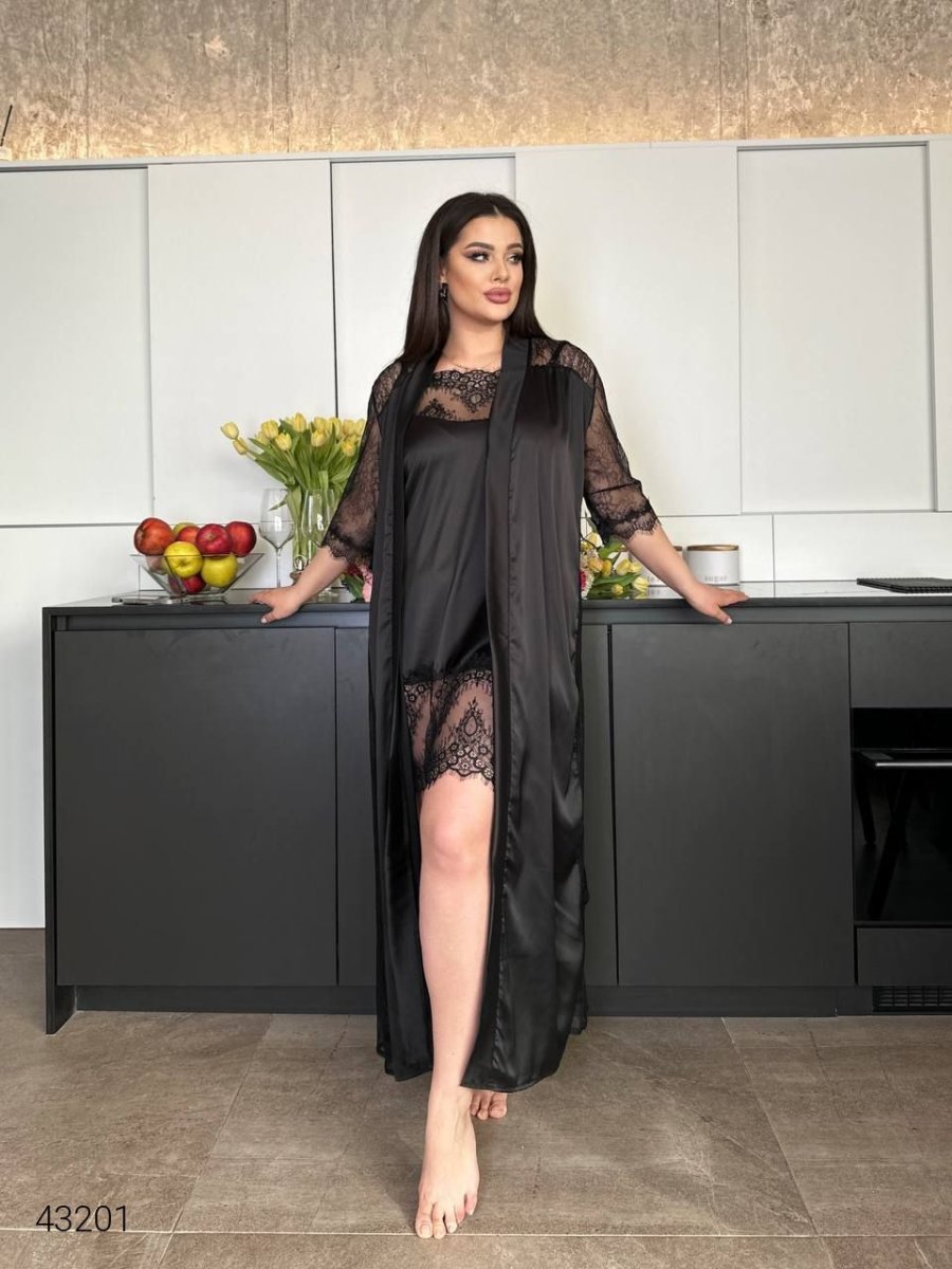 Халат женский шелковый с кружевом. Расширенный по низу со вставками вдоль всего халата по бокам. Кружевные рукава, пояс в комплекте. Ткань: шелк армани, не тянется. Состав: Полиэстер – 95%, Хлопок – 5%.