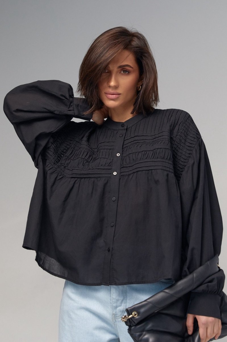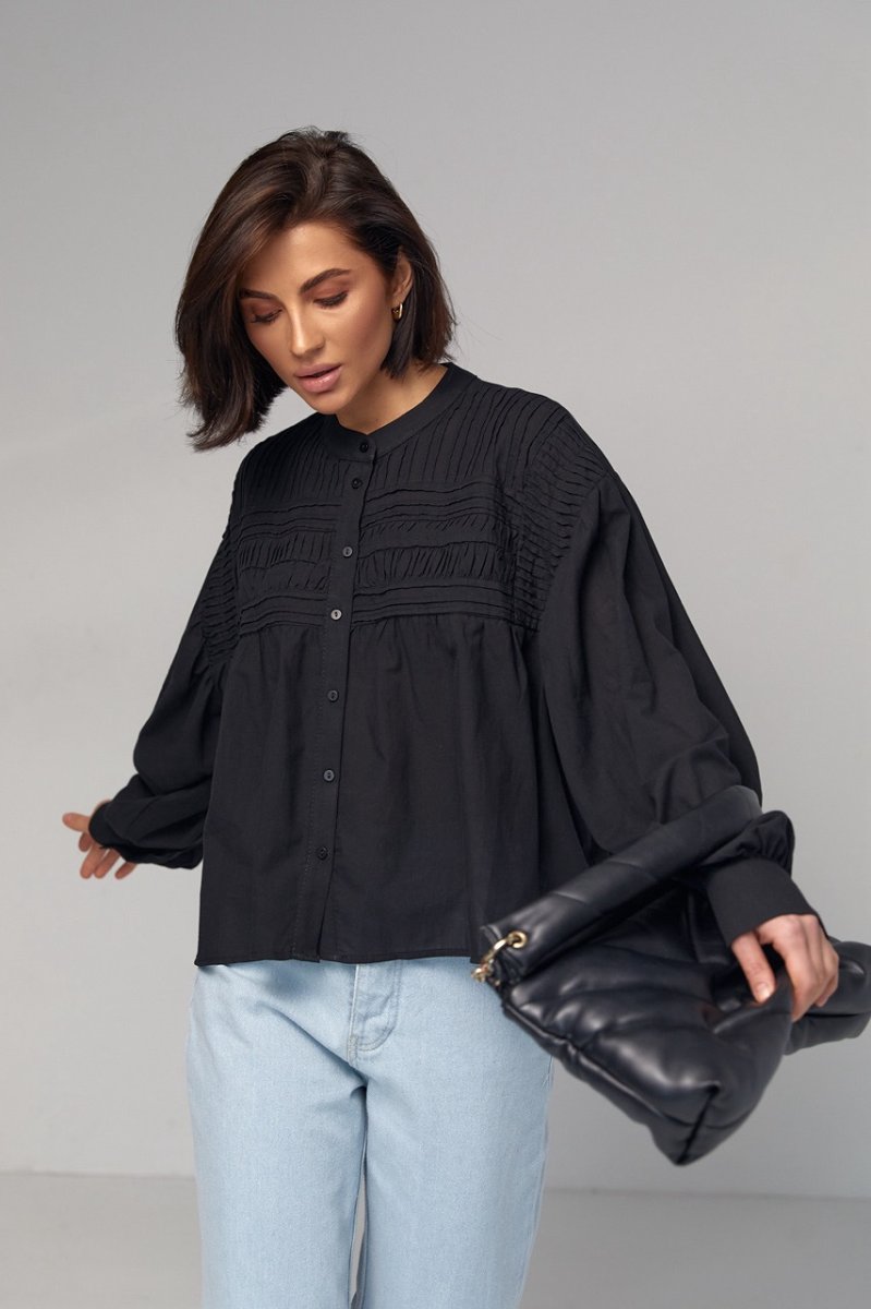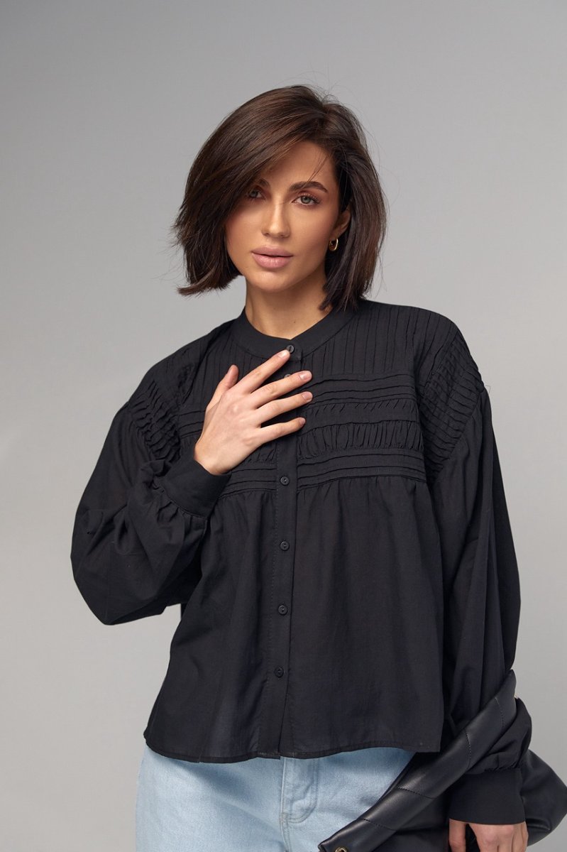 В модели круглая горловина дополнена воротником-стойкой. Широкие рукава собраны внизу на манжет с пуговичкой. Верх блузы украшен вертикальными и горизонтальными швами. Застегивается блуза спереди на пуговички.