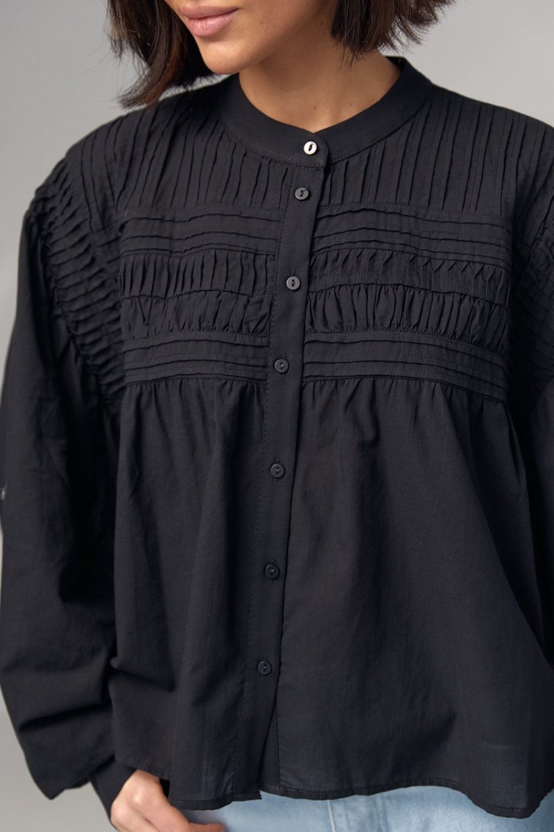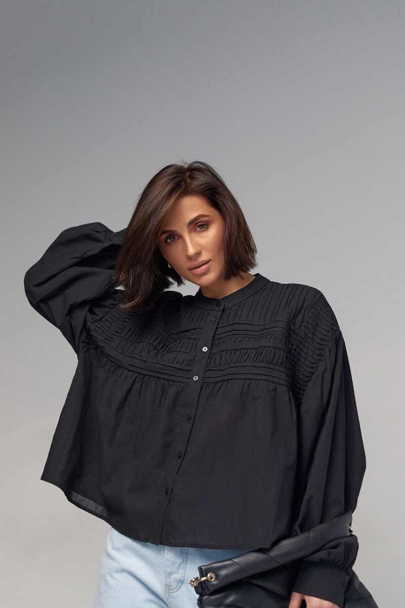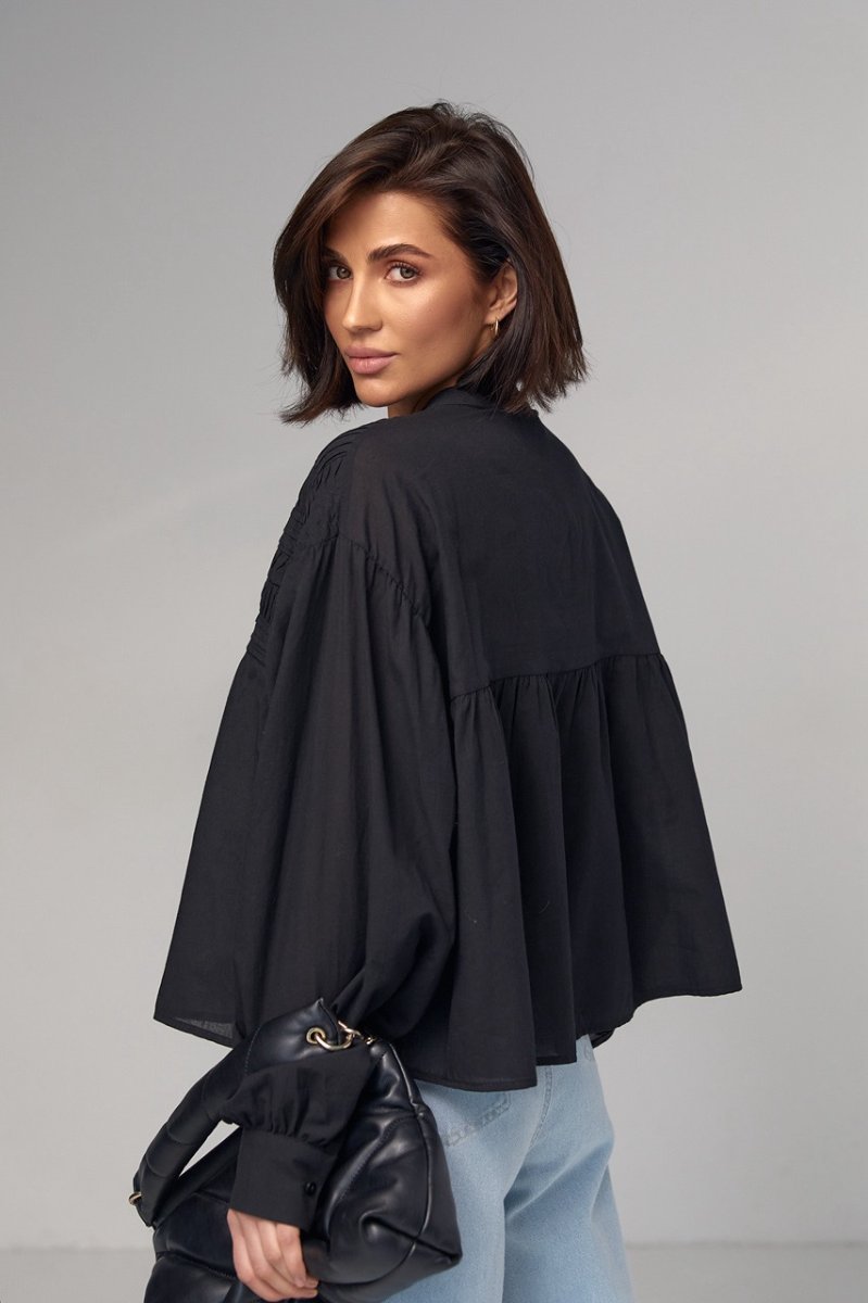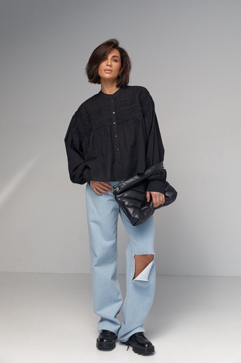 В модели круглая горловина дополнена воротником-стойкой. Широкие рукава собраны внизу на манжет с пуговичкой. Верх блузы украшен вертикальными и горизонтальными швами. Застегивается блуза спереди на пуговички.