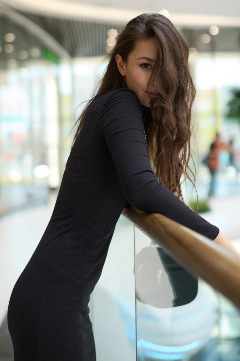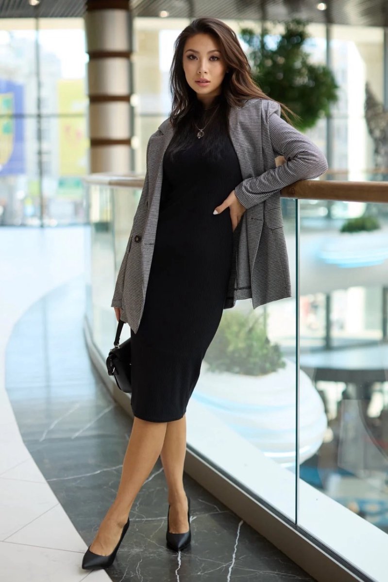 Изящное платье из трикотажа. Фасон приталенный, силуэтный. Воротник стойка. Рукав длинный. Имеется трикотажная подкладка.