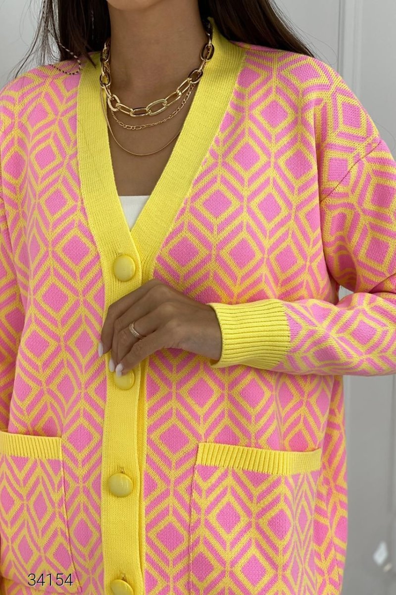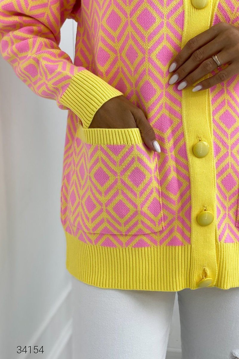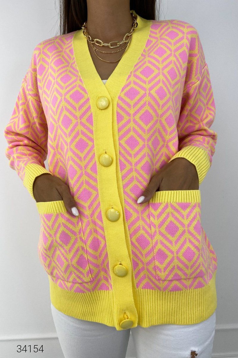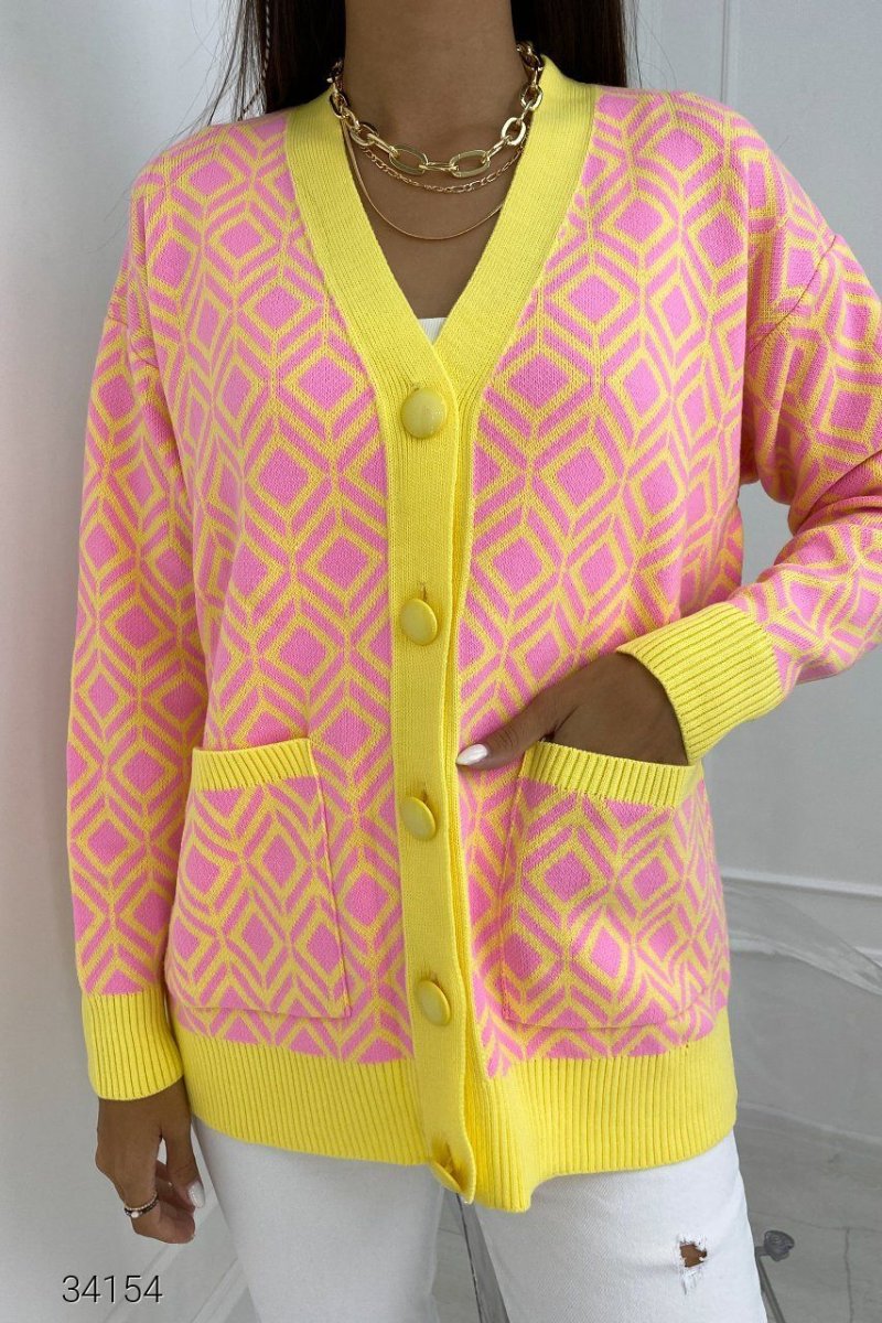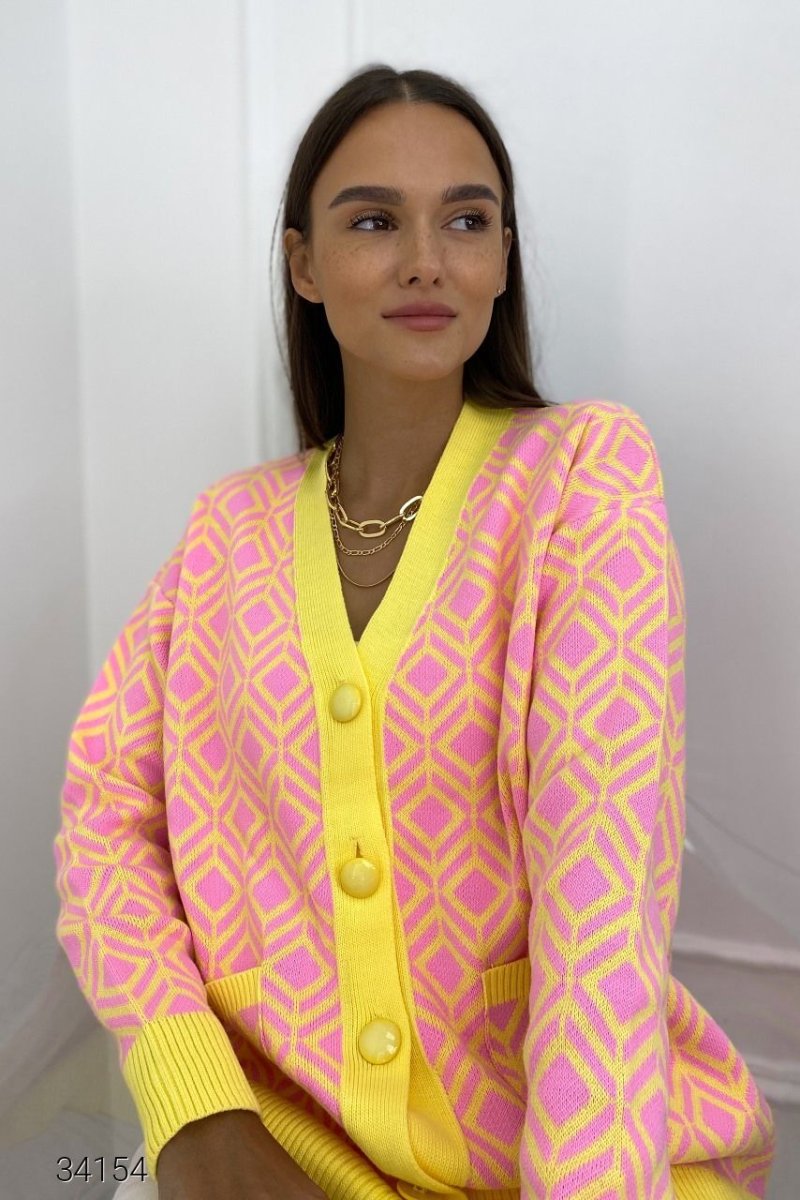 Кардиган свободного кроя из качественной вязки. V-образный вырез, заниженная линия плеч, манжеты и нижняя кромка в рубчик. Накладные карманы, планка на массивных пуговицах. Размер универсальный, подходит на 42-46. Состав ткани: 100% – акрил.
