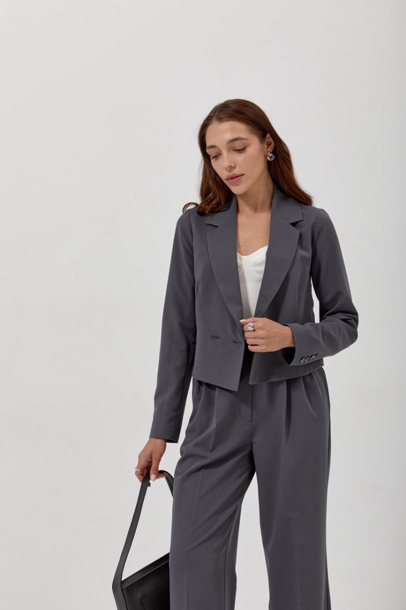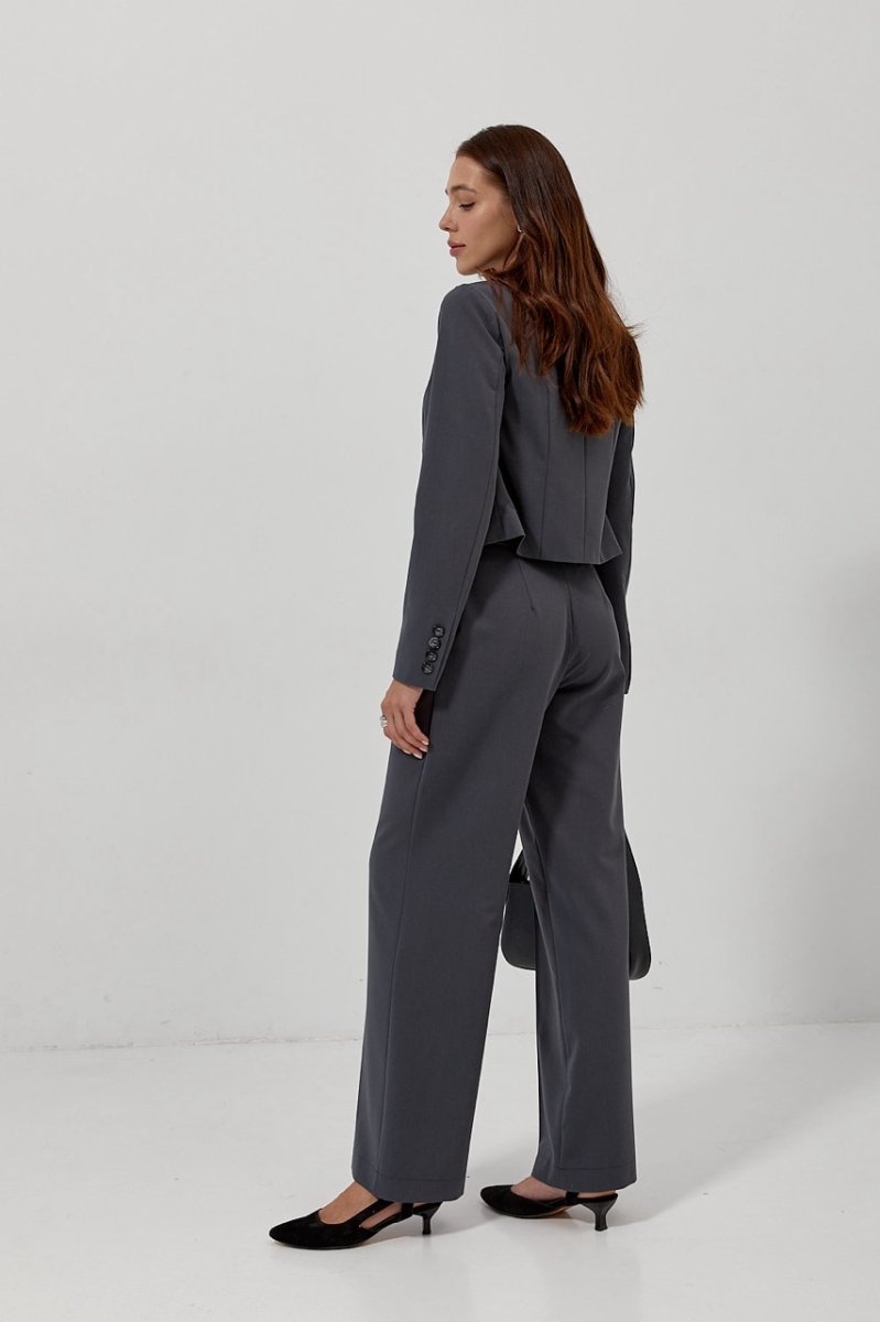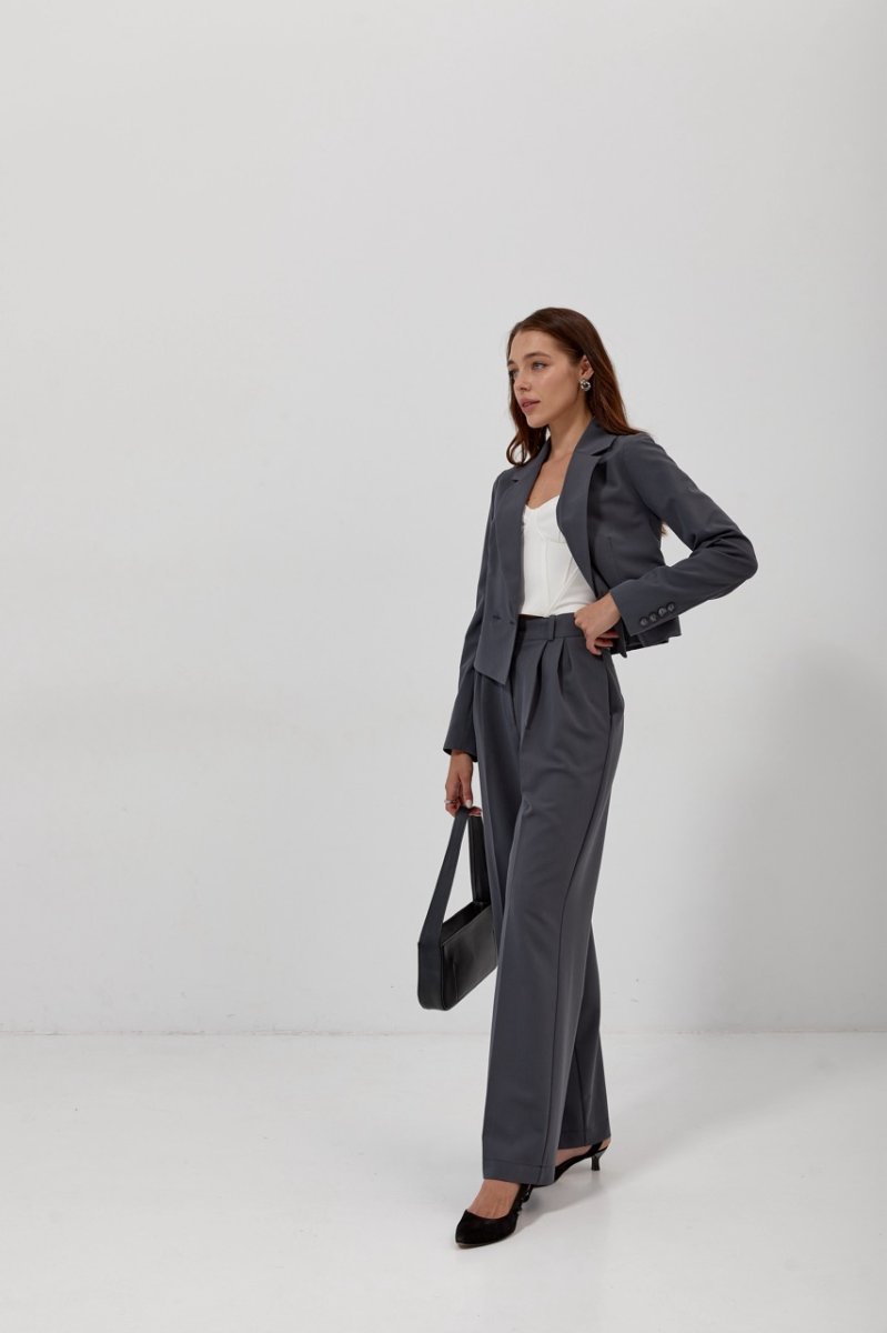 Классический костюм с укороченным жакетом брюки палаццо. Жакет с двубортной застежкой, воротник пиджачного типа. Полочка с декоративным карманом, с талиевыми выточками. Рукава втачные, длинные, двухшовные, по низу шлицы и пуговицы. Брюки палаццо прямого кроя. На талии шлевки для съемного пояса. Застежка: пуговица и скрытая молния. Передние половинки со стрелками и складками. Карманы находятся в боковых швах. Задние половинки с выточками.