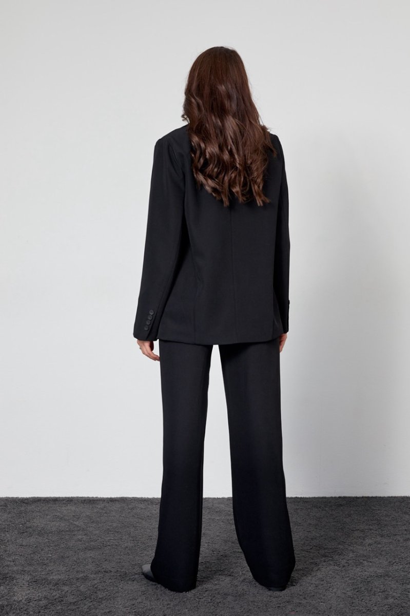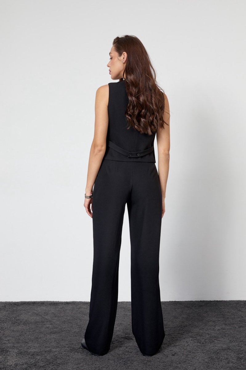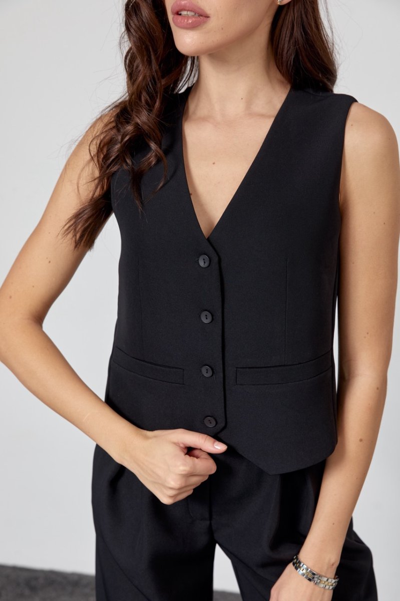 Классический костюм – тройка: пиджак, жилет, брюки палаццо. Пиджак двубортный, на подкладке, длиной ниже линии бедер. Рукава вшивные, длинные, двушовные с пуговицами на имитированной шлике. Карманы прорезные с обшивками. Воротник пиджачного типа, застегивающийся на пуговицы, низ края борта округлен. Жилет классический, без рукавов. Брюки прямого кроя На талии шлевки для съемного пояса. Застежка: пуговица и скрытая молния. Передние половинки со стрелками и складками. Карманы находятся в боковых швах. Задние половинки с выточками.