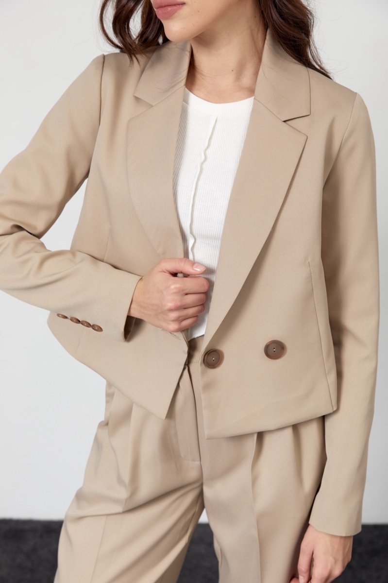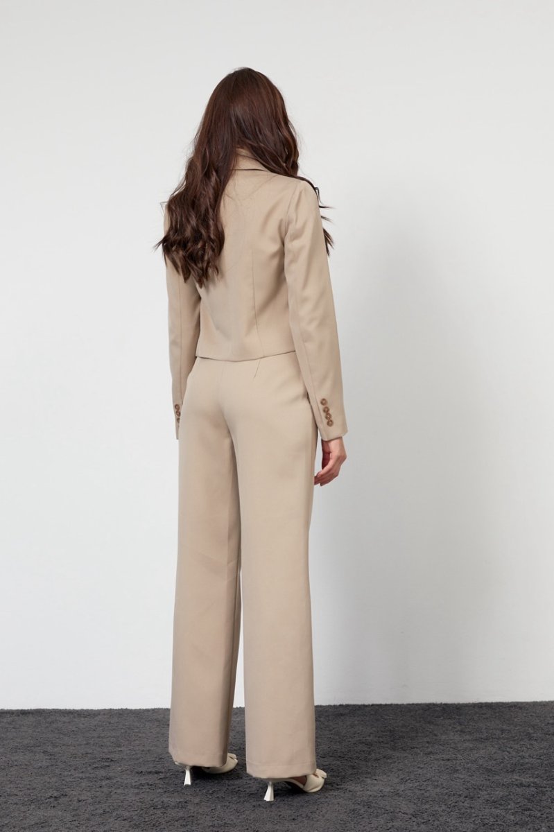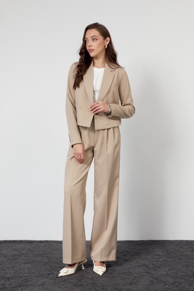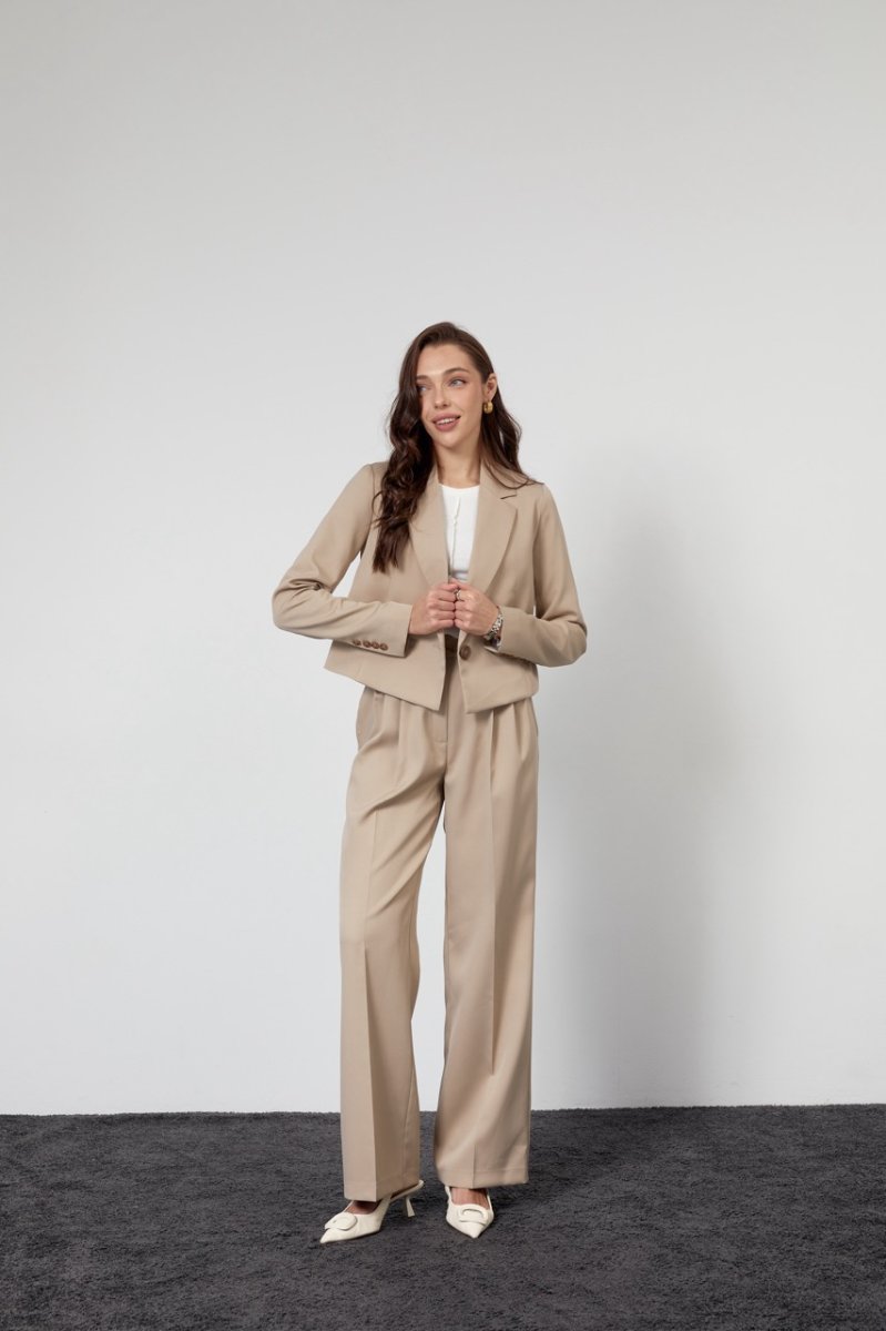 Классический костюм с укороченным жакетом брюки палаццо. Жакет с двубортной застежкой, воротник пиджачного типа. Полочка с декоративным карманом, с талиевыми выточками. Рукава втачные, длинные, двухшовные, по низу шлицы и пуговицы. Брюки палаццо прямого кроя. На талии шлевки для съемного пояса. Застежка: пуговица и скрытая молния. Передние половинки со стрелками и складками. Карманы находятся в боковых швах. Задние половинки с выточками.