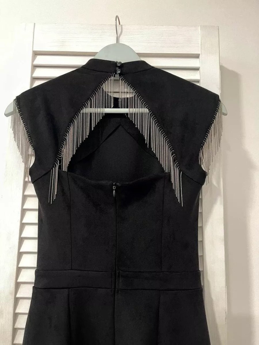 Вечерний комбинезон из эко-замши с открытой спинкой и метализированной бахромой. Комбинезон с аккуратным воротником-стойкой. Застёгивается на пуговицу и скрытую молнию на спине. Открытая спинка с бахромой придаст образу еще больше женственности и сексуальности. Комбинезон смотрится так же роскошно, как и традиционное длинное платье. Подходит для самых разных событий – молодежных тусовок, презентаций, праздничных, официальных и культурных мероприятий.