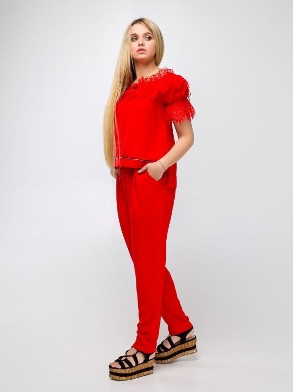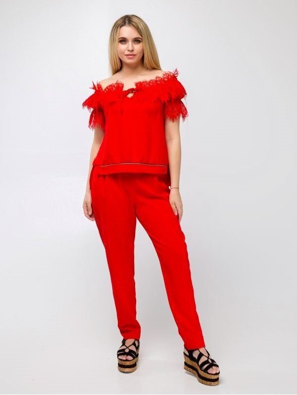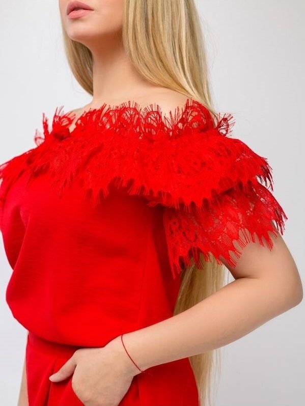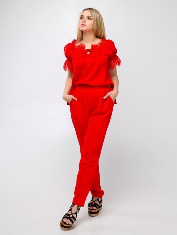 Женский комбинезон-трансформер Сонг - практичное и стильное решение для вашего летнего образа. Легко разделяется на блузу и брюки при помощи молнии по переду изделия. Блуза свободного кроя, дополнена гипюром по горловине и на рукавах. По линии горловины эластичная вставка, по центру завязки. На манжетах рукавов вставки из резинки. Спинка блузы слегка удлинена, по бокам разрезы.