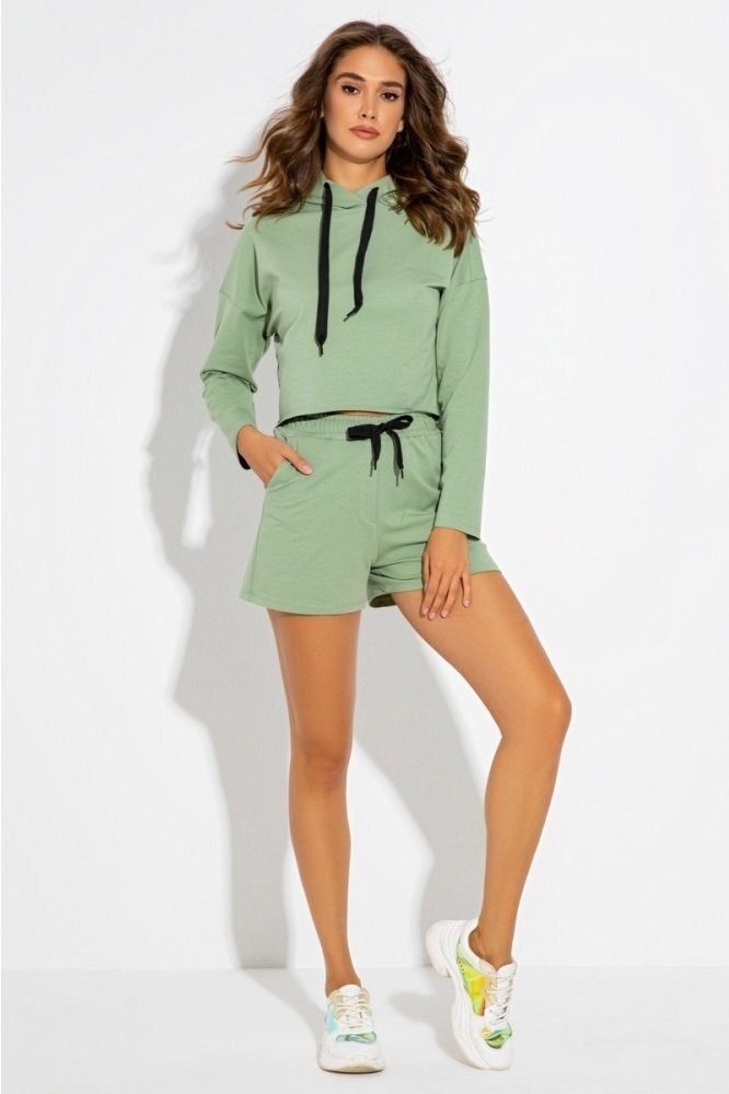 Комфортный костюм для прогулок и work out: худи с капюшоном и рукавом реглан; шорты с эластичной талией и боковыми карманами.