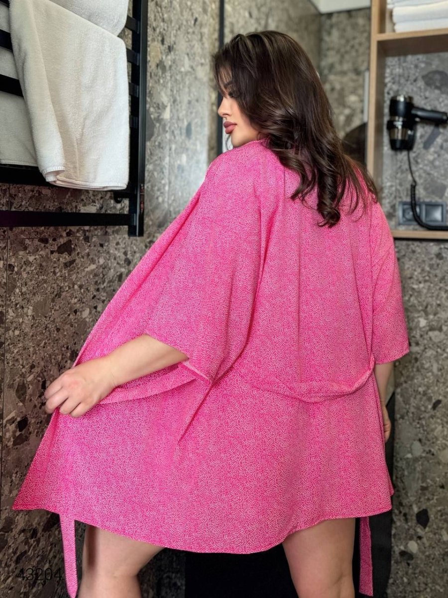 58-60 (длина халата – 92 см, рукав – 34 см, ОГ (топ) – 138 см, высота топа – 38 см, ОТ (шорт) – 92 см (растягивается до 142 см), ОС (шорт) – 142 см, длина по боковому шву - 34 см)