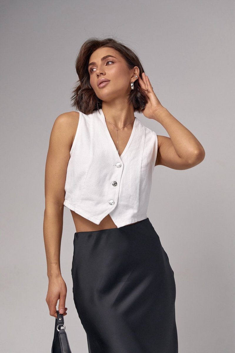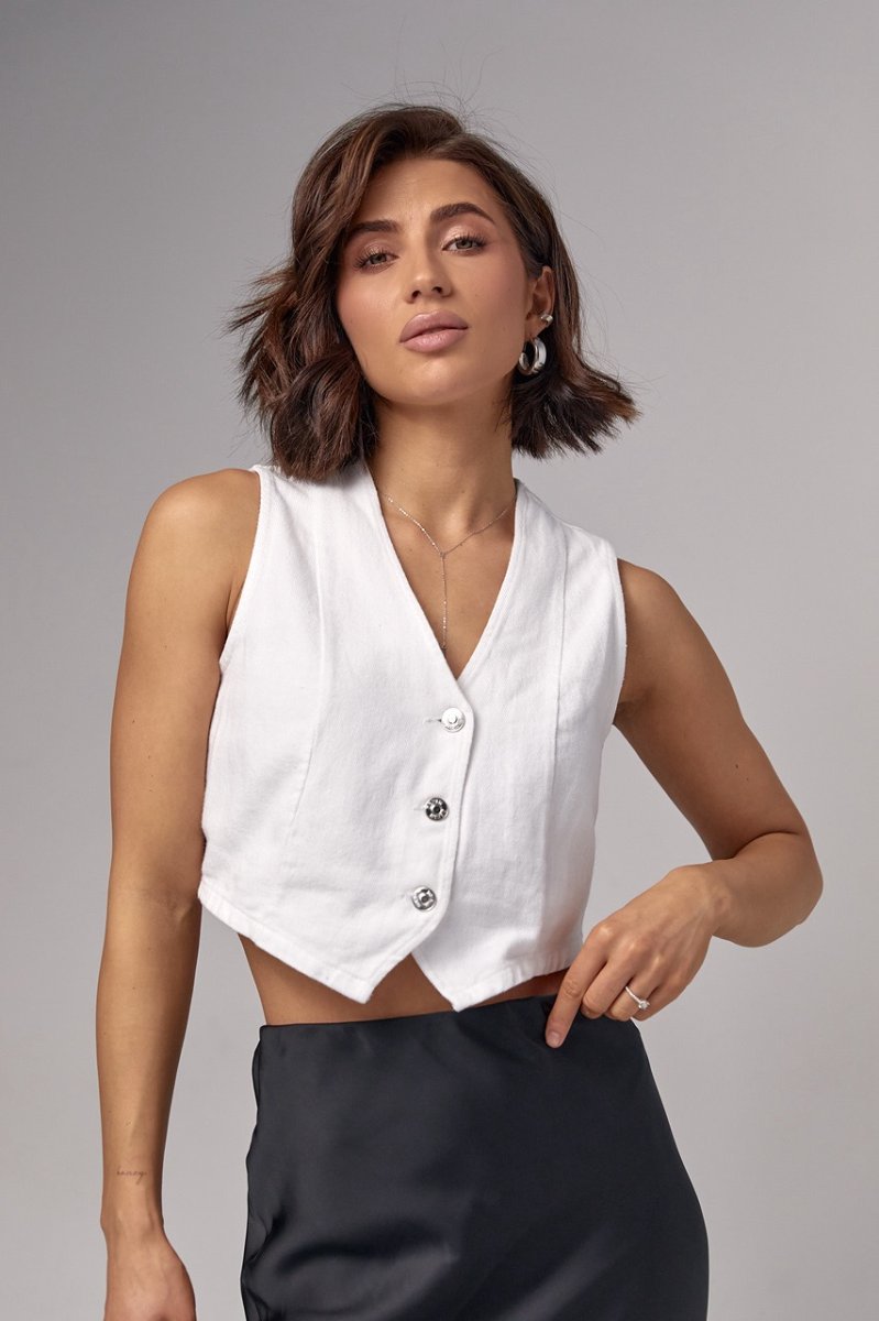 Жилет имеет V-образную горловину и укороченный крой, который открывает талию. Он изготовлен из стопроцентного котонна, который обеспечивает комфорт и легкость в носке. Металлические пуговицы служат акцентом, придавая образу характер.