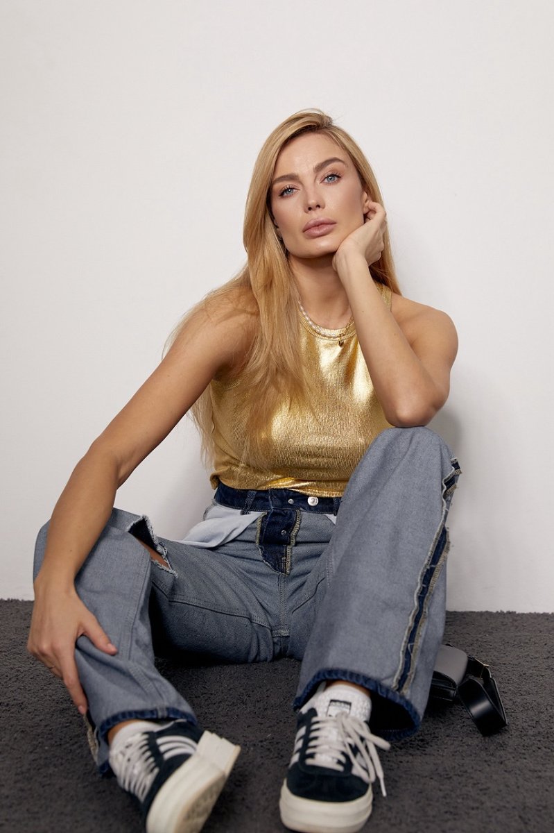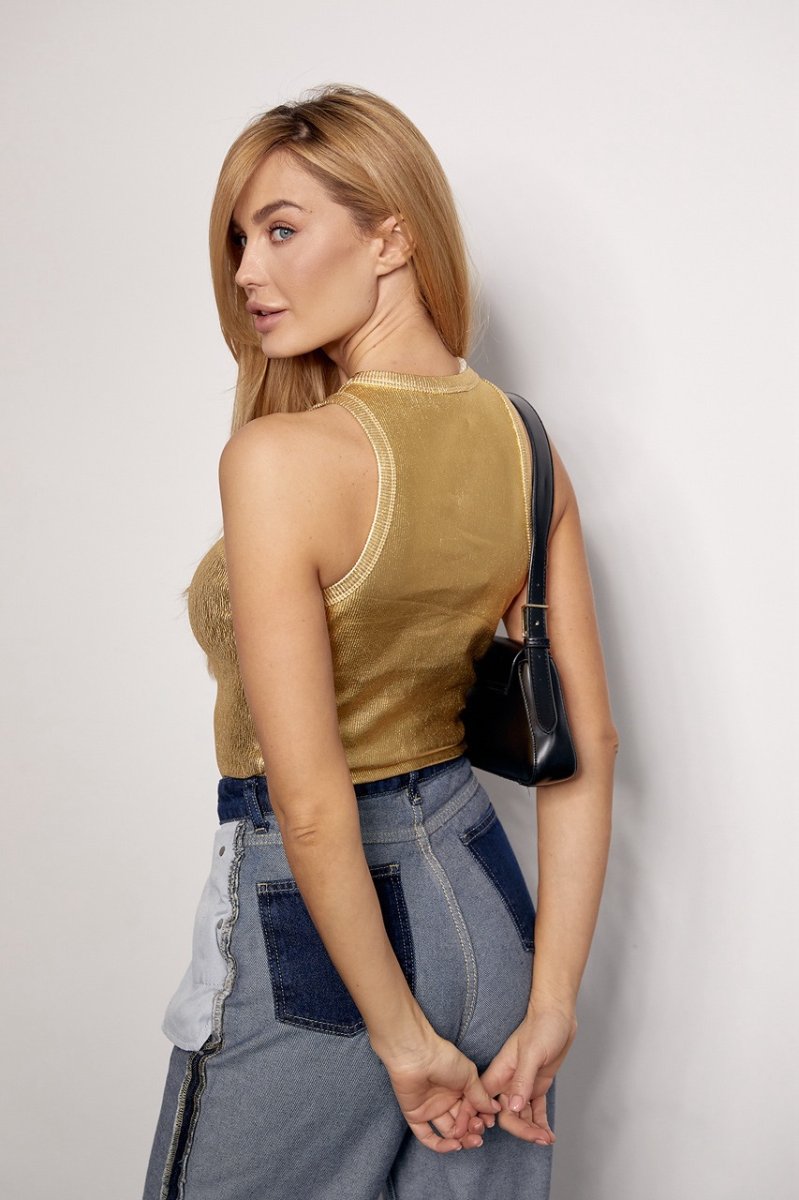 Модель сшита из трикотажа в мелкий рубчик, с прямым низом и с широкой окантовкой пройм и круглой горловины.