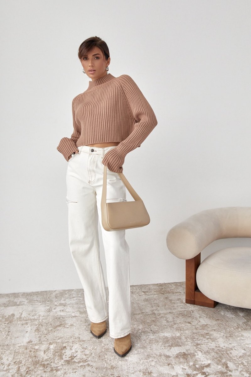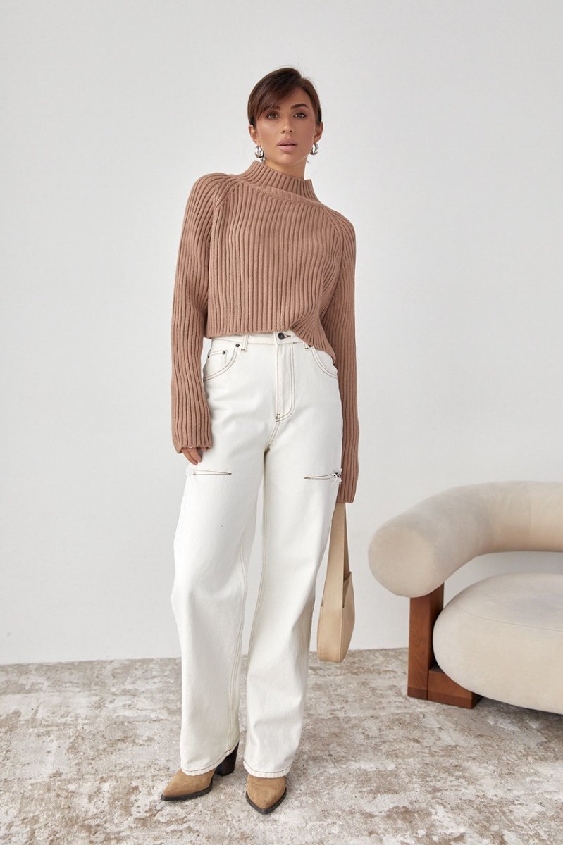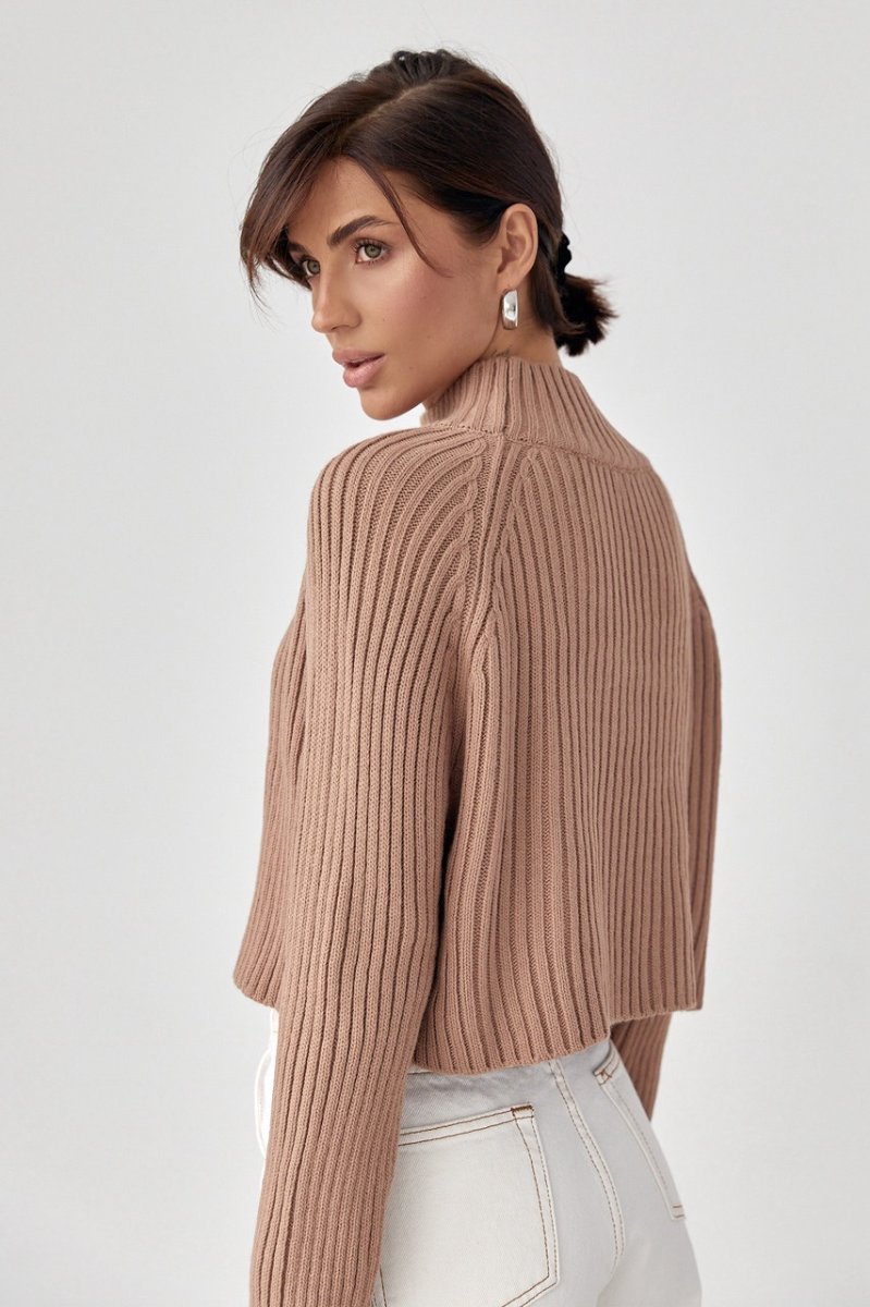 Модель полностью выполнена из фактурной машинной вязки в технике "резинка". Низ прямой, рукава длинные, а круглая горловина дополнена высоким воротником-стойкой.