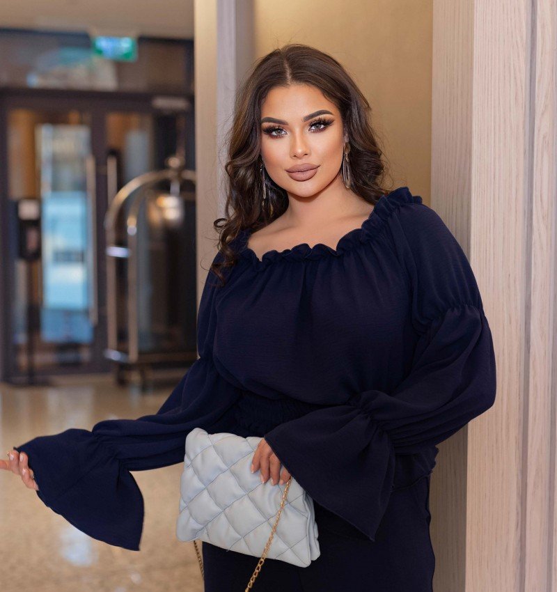 Рукава блузы дополнены резинкой, что придает стильный акцент и создает эффектный волан на запястьях. Талия выделена широкой резинкой, что создает красивый эффект и делает силуэт более подтянутым. Блуза также дополнена воланом снизу, дополняющим композицию. Брюки с карманами по бокам дополняют этот костюм своей лаконичностью, создавая элегантный, но такой простой одновременно образ.