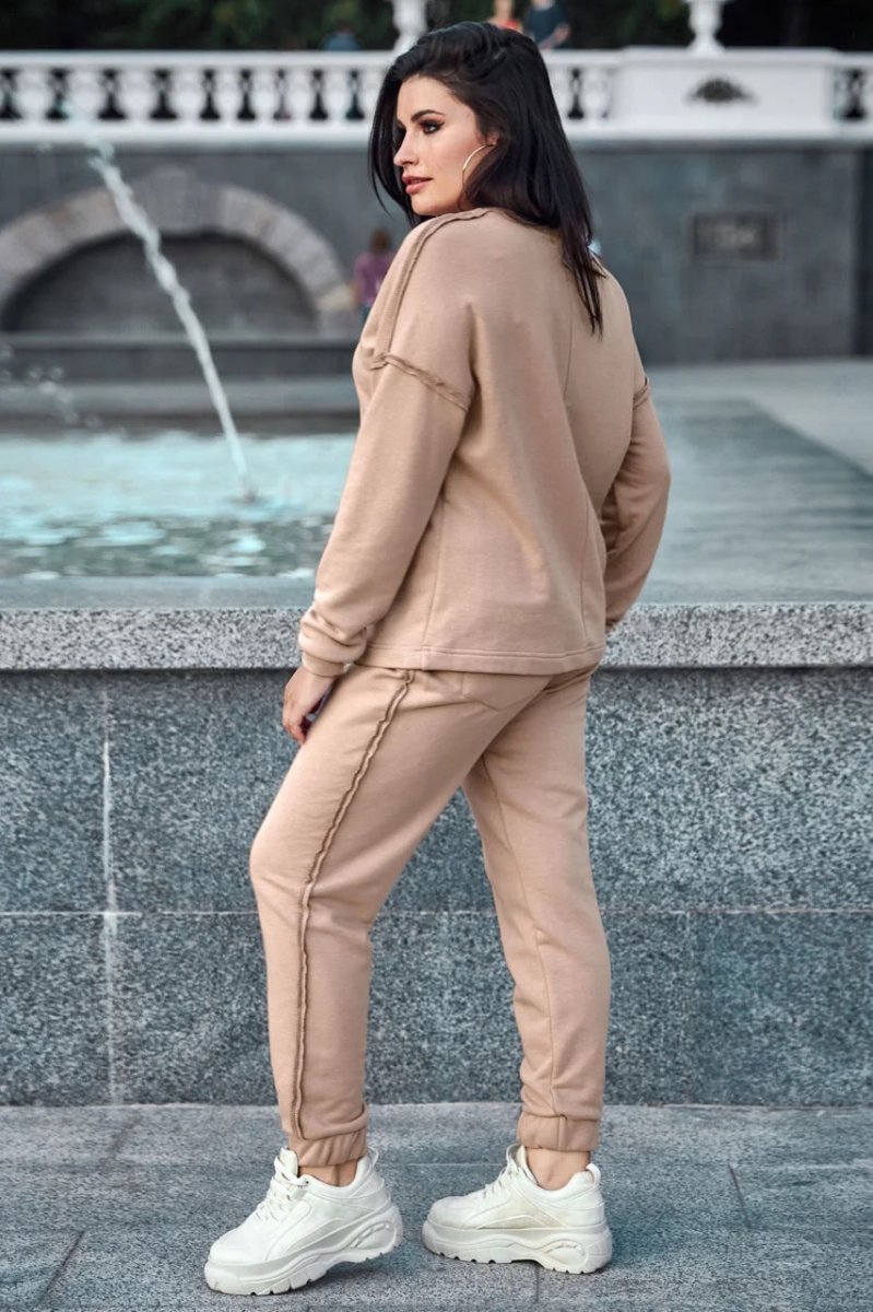Коллекция Goodbye summer plus size радует новой стильной новинкой для летнего и демисезонного гардероба — костюм свободного кроя обеспечивает спортивный или повседневный образ по последним модным трендам. Особая изюминка модели - швы на лицевой стороне и накладные карманы на брюках с высокой посадкой.