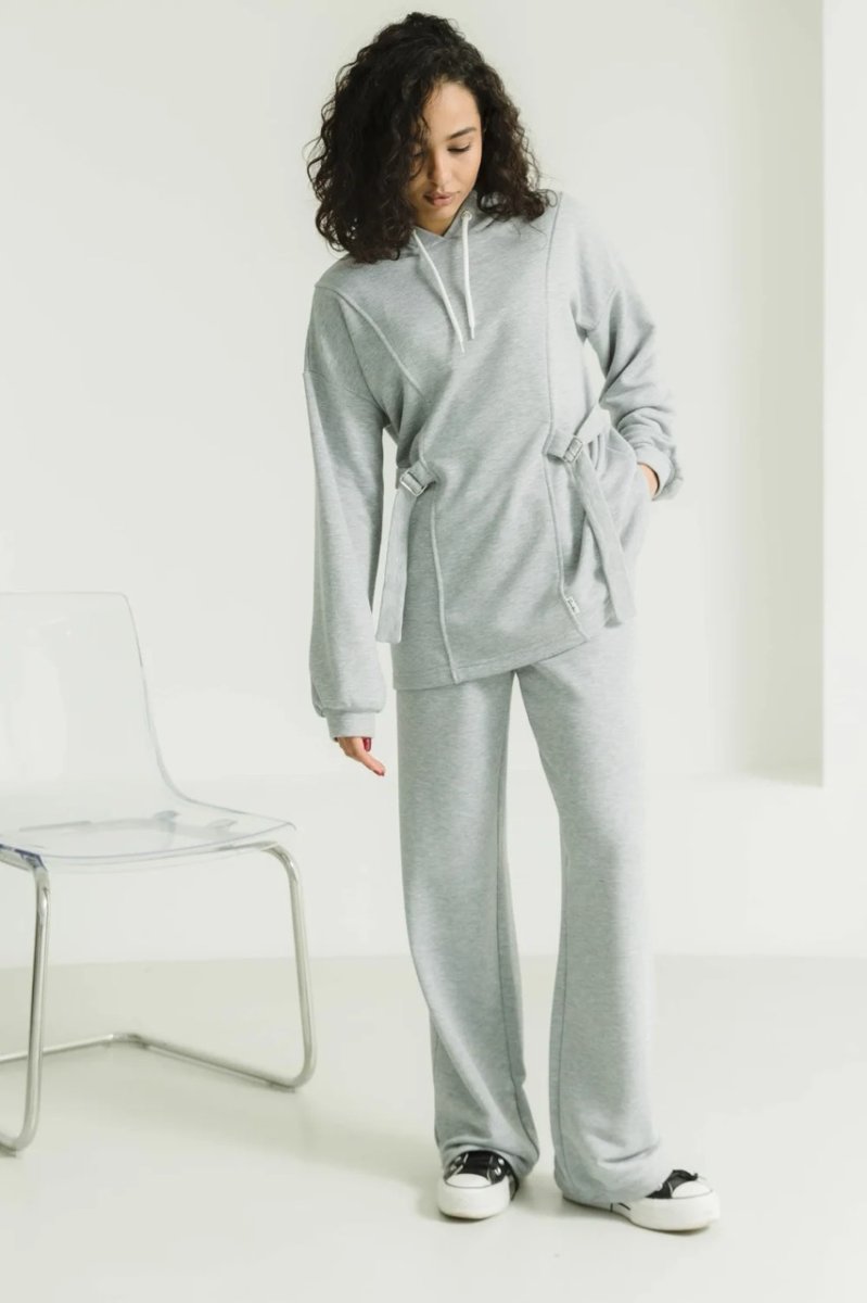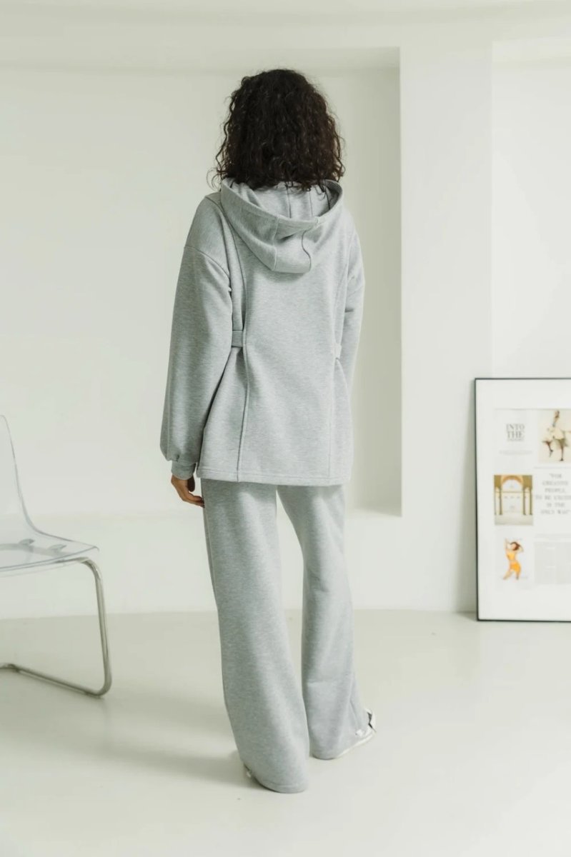 Конструктивные элементы: разрезная полка, брюки на резинке, капюшон