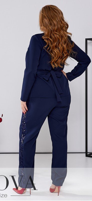 Костюм состоит из жакета на запах, который добавляет изысканности образу. V-вырез горловины создает женственность и изящество, а завязка на спинке, проходя через боковое отверстие, не только фиксирует жакет надежно, но и придает уверенности. Асимметричный подол придает образу динамики.