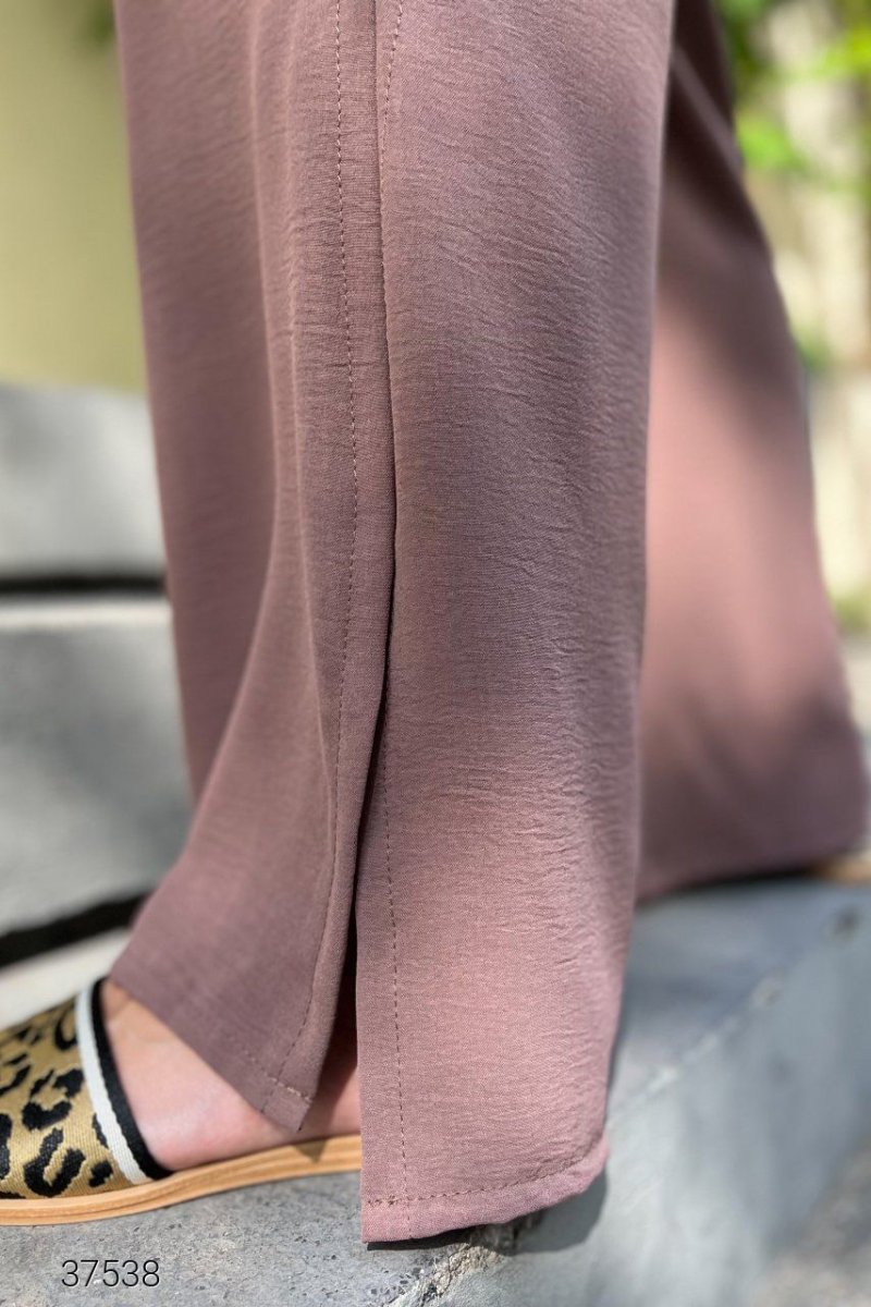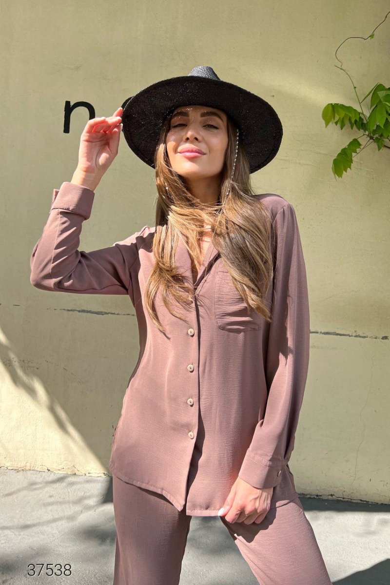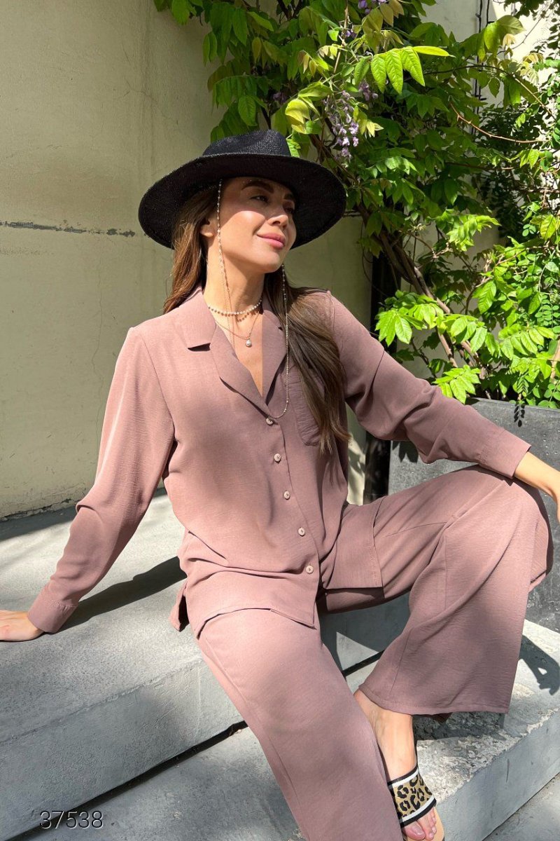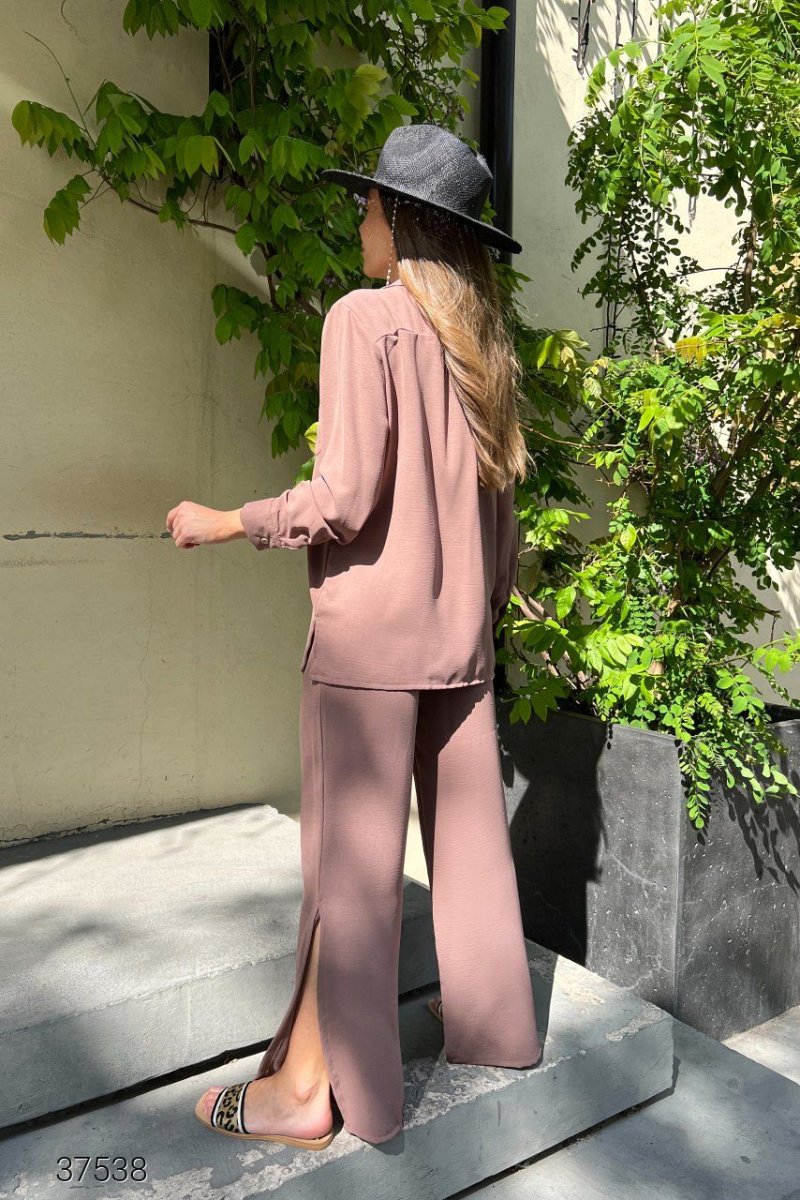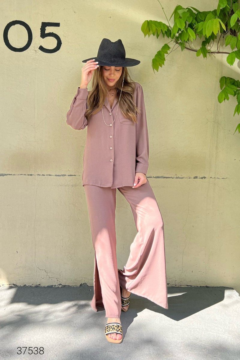 Костюм из рубашки и брюк. Рубашка застегивается на пуговицы. Брюки на резинке с разрезами снизу.