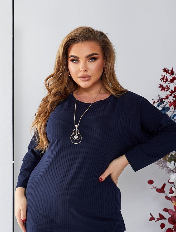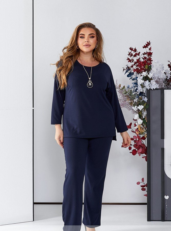 Монохромный костюм двойка сделан из ткани в рубчик. Он состоит из кофты и брюк прямого кроя. Брюки дополнены эластичной резинкой для дополнительного удобства во время ношения. Комплект также содержит длинное украшение, придавая образу изысканности. Этот стильный и универсальный костюм подходит как для деловых встреч, так и для повседневного использования.