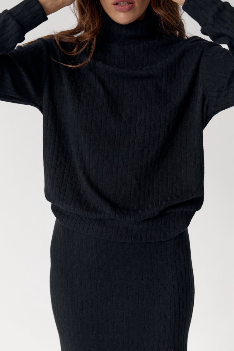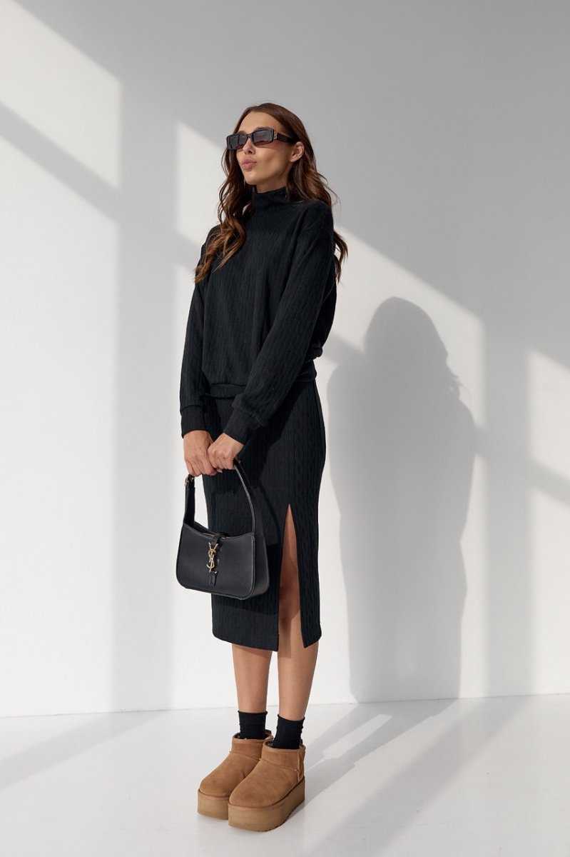 Костюм состоит из свитера и юбки. Свитер крой свободный, линия плеча приспущена. Рукава втачные, длинные. По низу изделия и по низу рукавов распошивочный шов. Юбка, длина миди, облегающая, на талии резинка, разрез в среднем шве заднего полотнища.