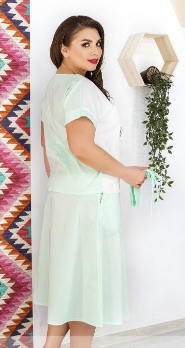 Костюм-двойка, состоящий из блузки и юбки. Удлиненная прямая блузка с короткими рукавами. Рукава собраны в манжеты. Спина блузки выполнена в тон юбки. Юбка А-силуэта с посадкой на талии дополнена скрытыми карманами. На спине юбка застегивается на молнию и пуговицу. Отрезной пояс юбки дополнен съемным поясом в тон.