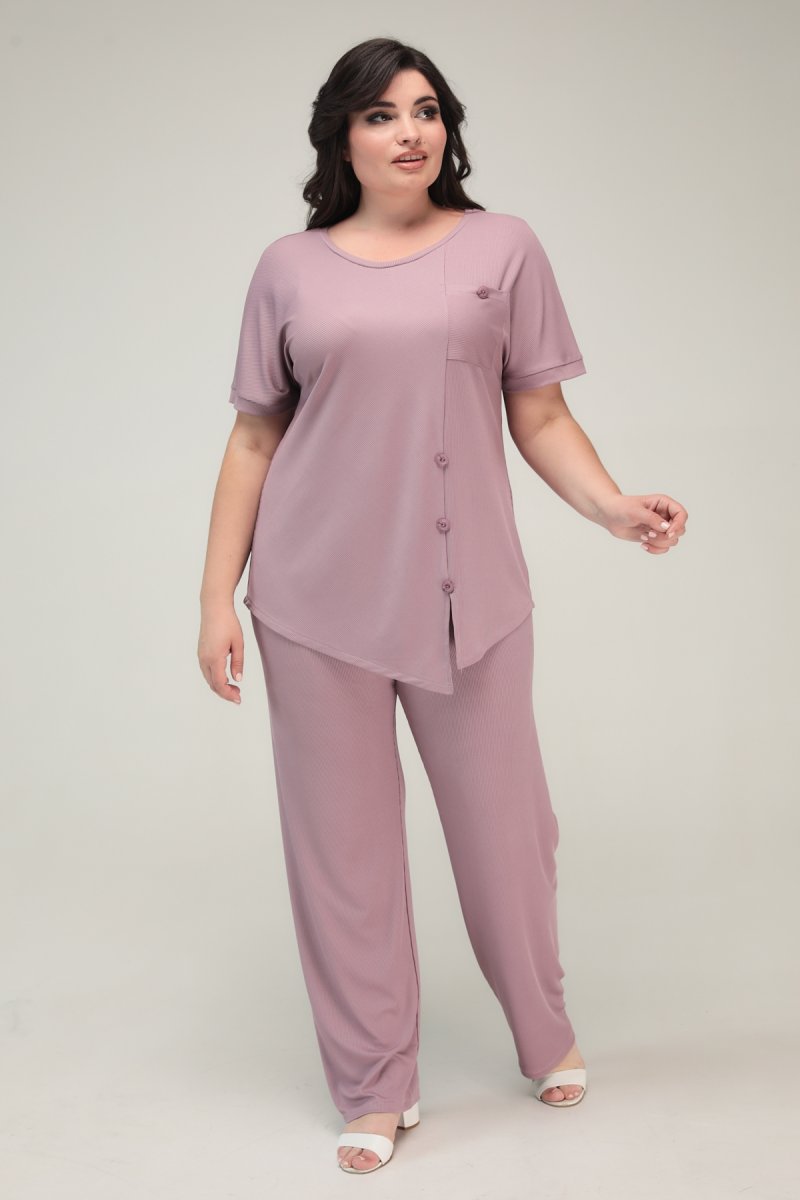 Костюм двухпредметный из ткани, трикотаж, рубчик. Ткань летняя, имеет рефленную, отчетливо выраженную структуру. Материал эластичный, хорошо ложится по фигуре. Брюки прямые на резинке. Футболка прямого силуэта, рукав цельнокроенный на манжете. Полка ассиметрична с вертикальным швом и снизу с разрезом. По центру выполнена горизонтальная капля, слева на груди - накладной карман. Пуговицы по всему изделию – декоративные.
