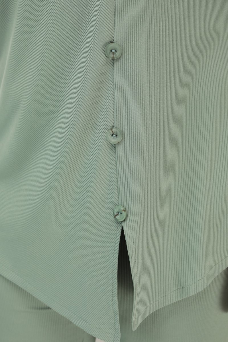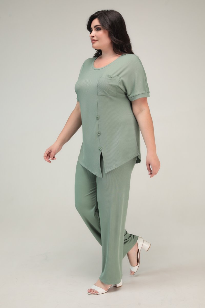 Костюм двухпредметный из ткани, трикотаж, рубчик. Ткань летняя, имеет рефленную, отчетливо выраженную структуру. Материал эластичный, хорошо ложится по фигуре. Брюки прямые на резинке. Футболка прямого силуэта, рукав цельнокроенный на манжете. Полка ассиметрична с вертикальным швом и снизу с разрезом. По центру выполнена горизонтальная капля, слева на груди - накладной карман. Пуговицы по всему изделию – декоративные.