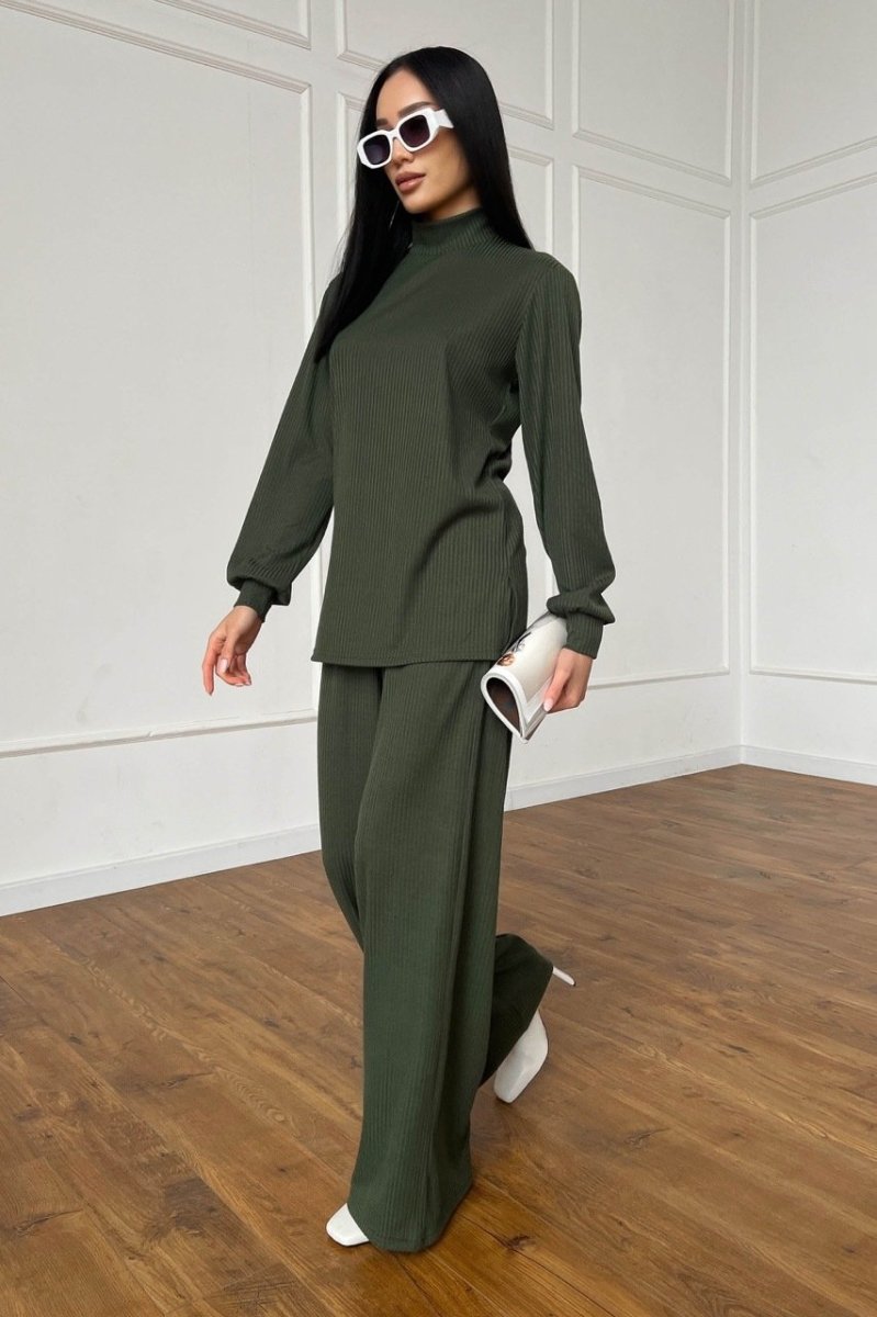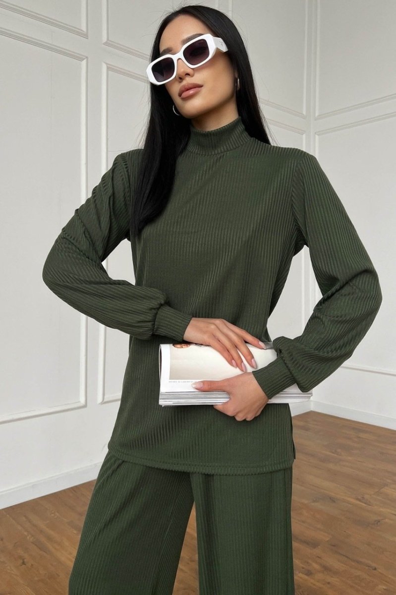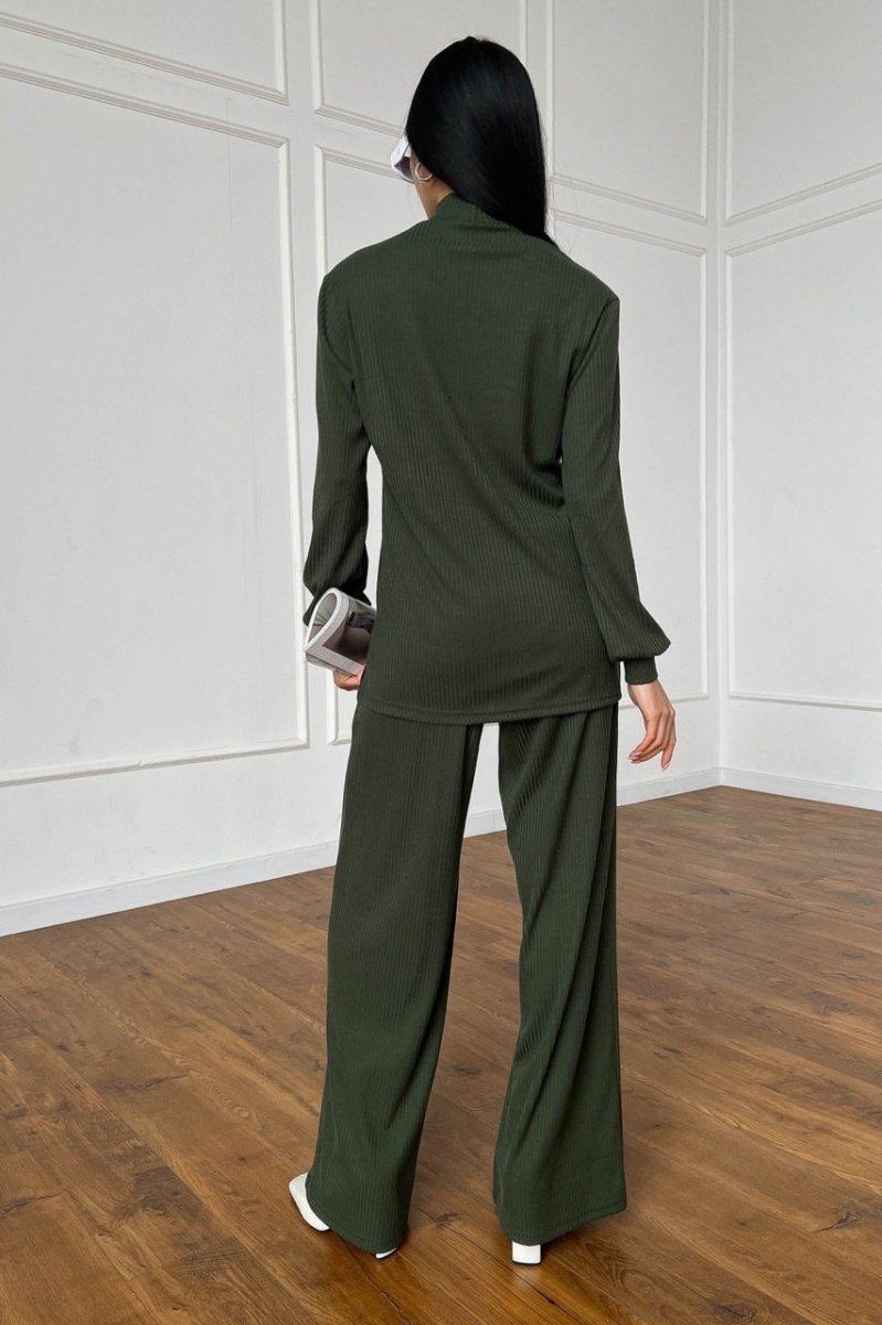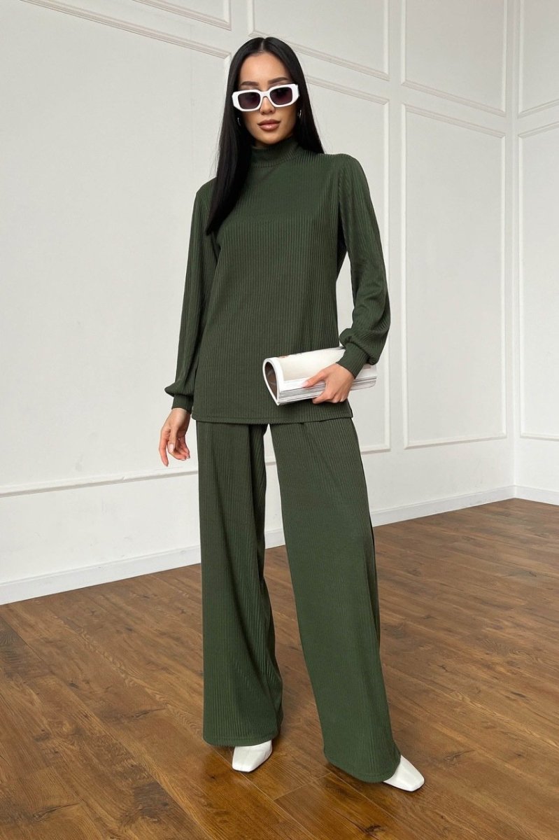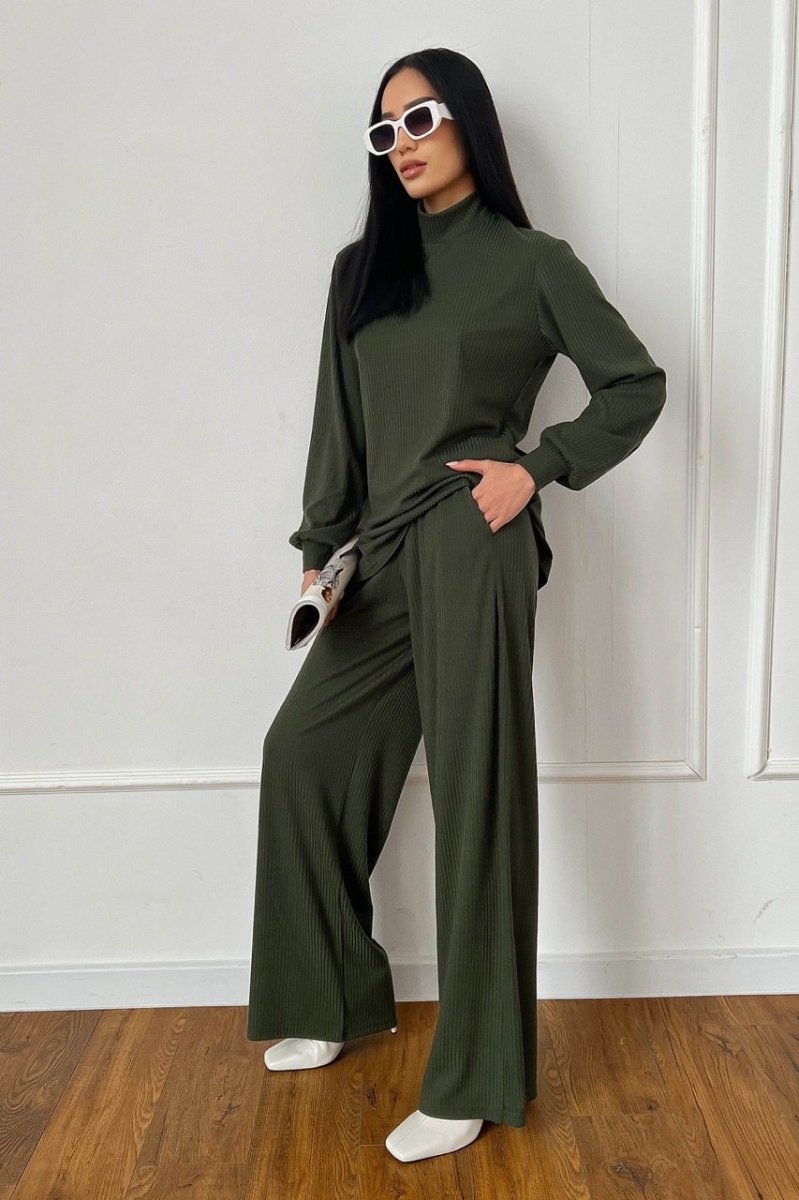 Модель кроя oversize с туникой и широкими брюками с высокой посадкой на талии.