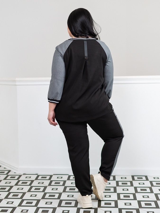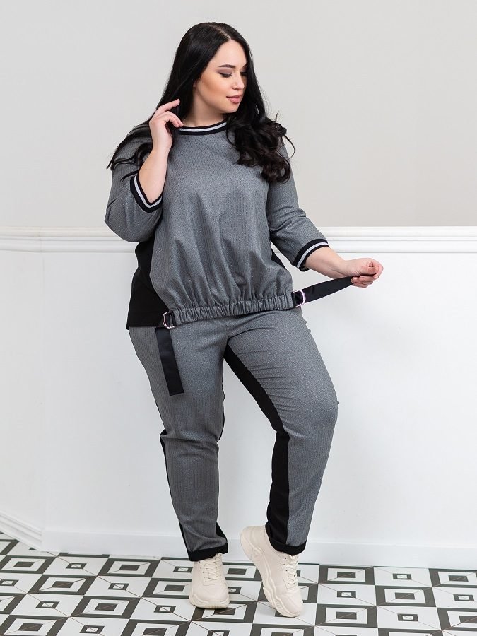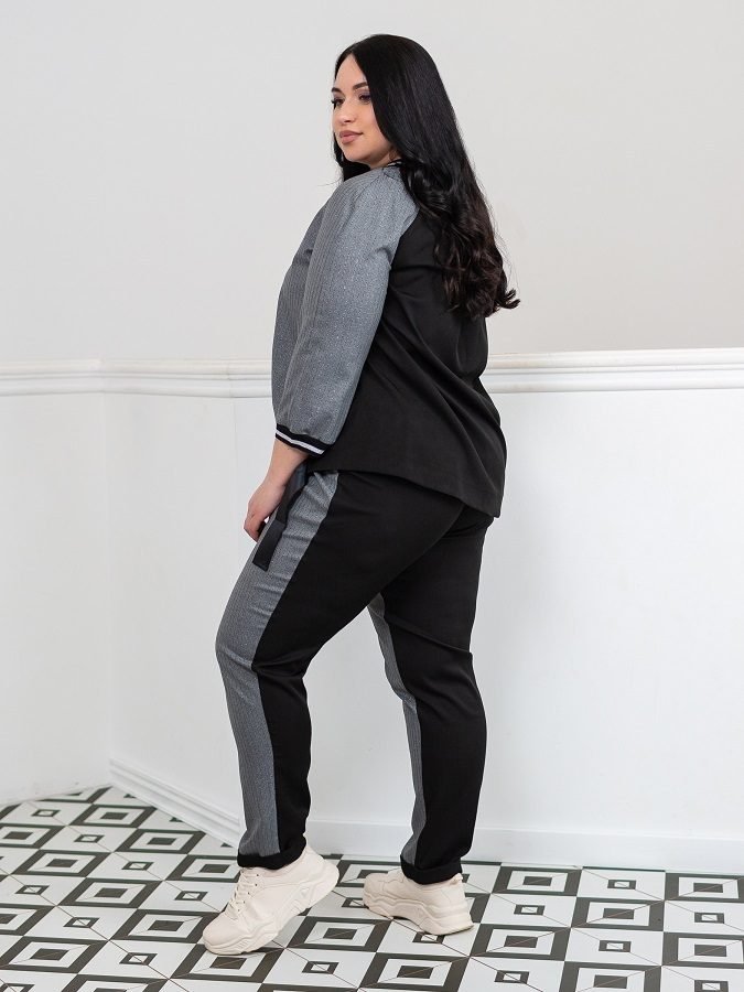 Эффектный брючный костюм из комбинации двух тканей. Перед выполнен из материала с незначительным включением нитей люрекса.
