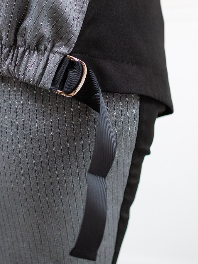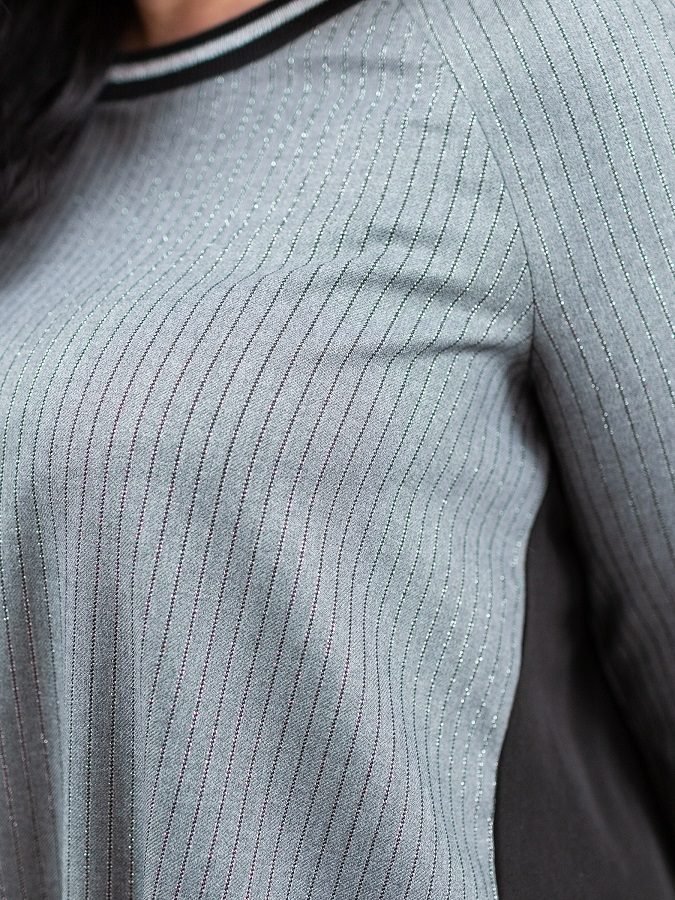 Кофта свободного кроя, на горловине и рукавах довяз с металлонитью. Нижняя часть полочки с эластичной вставкой и регулировкой лентами. Спинка слегка удлинена, по центру лента с металлическим декором.