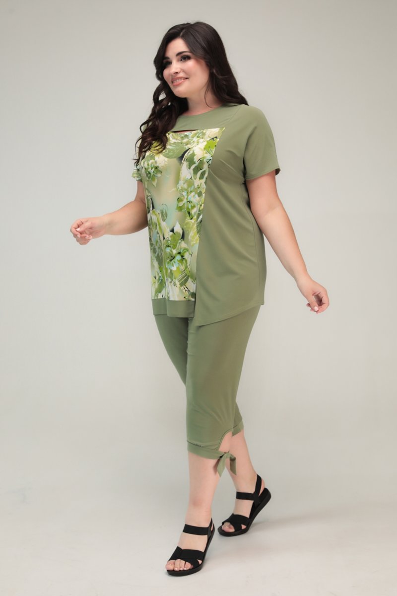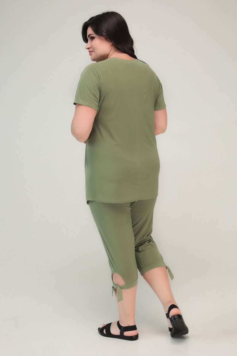 Костюм двухпредметный, капри и футболка, выполненный из качественного материала – трикотаж масло (Южная Корея). Ткань имеет гладкую текстуру, прочная, износостойкая, эластичная, красиво облегающая фигуру и имеет отличную воздушно-пропускную способность. Не деформируется после стирки и не подвергается образованию катышек. Капри прямого силуэта внизу на манжете с завязками. Футболка прямого силуэта, рукав цельнокроенный. Полка ассиметрична, снизу по диагональному шву выполнен разрез. По центру полочки, в шве, выполнена горизонтальная капля. Низ изделия асимметричный, в правом боковом шве – разрез.