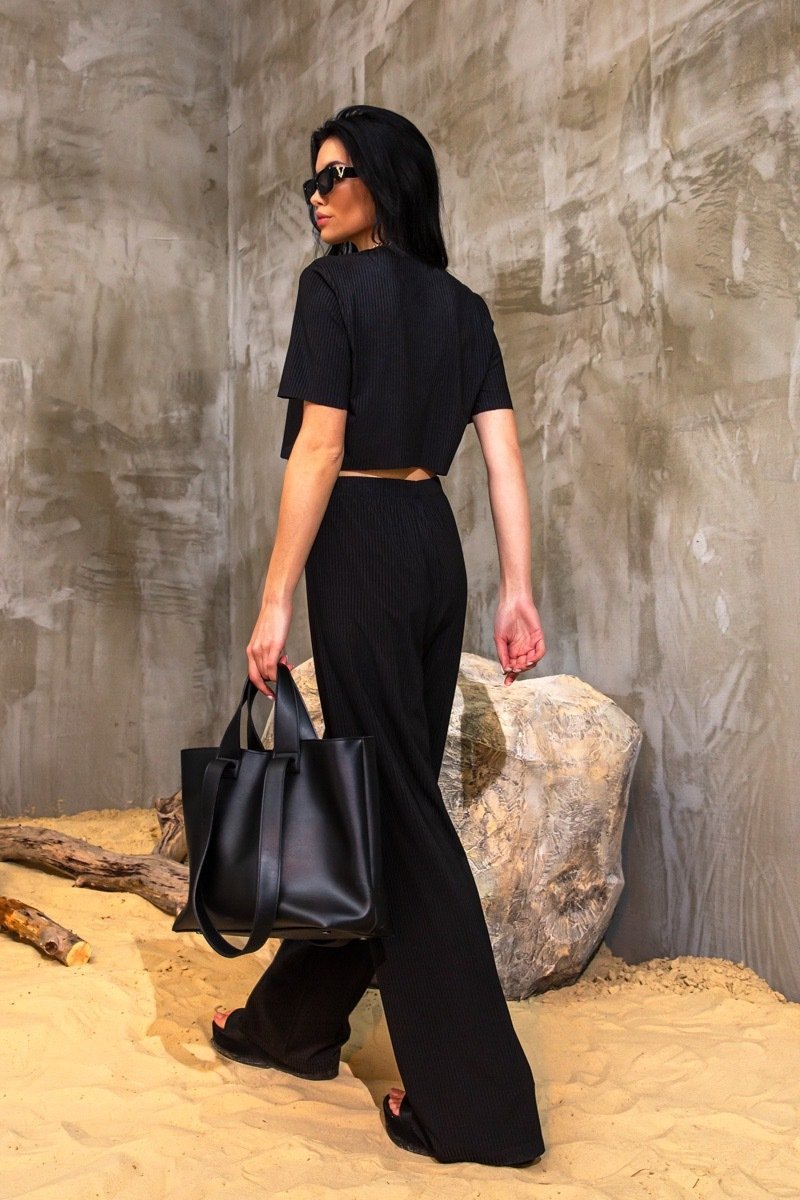 Стильный и удобный летний костюм, который будет незаменим в жаркие дни. Широкие брюки палаццо и объемная укороченная футболка подойдут для девушки с любым типом фигуры.