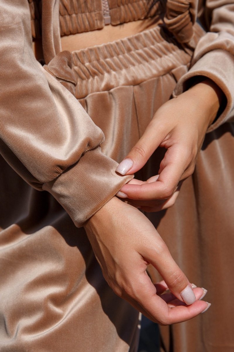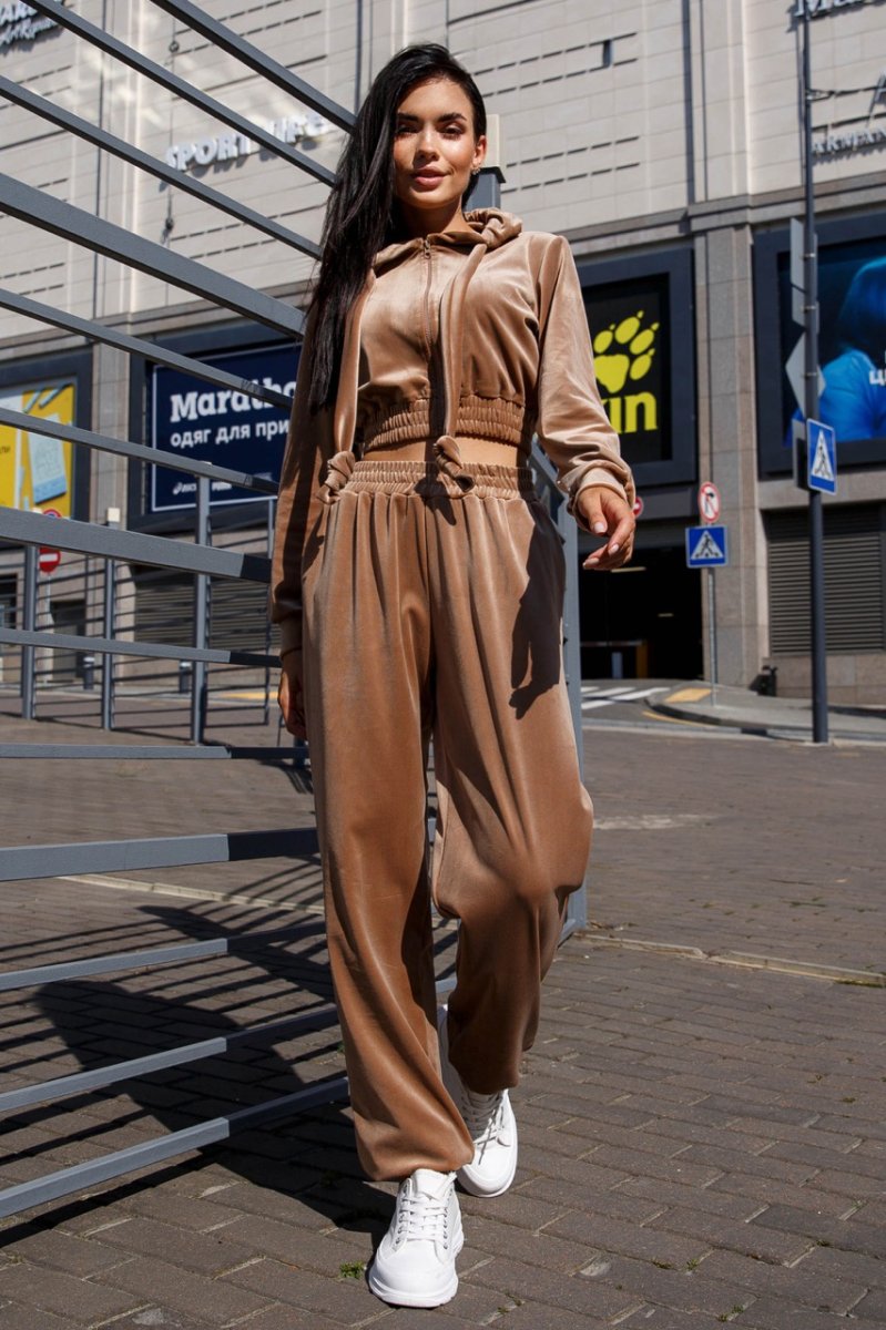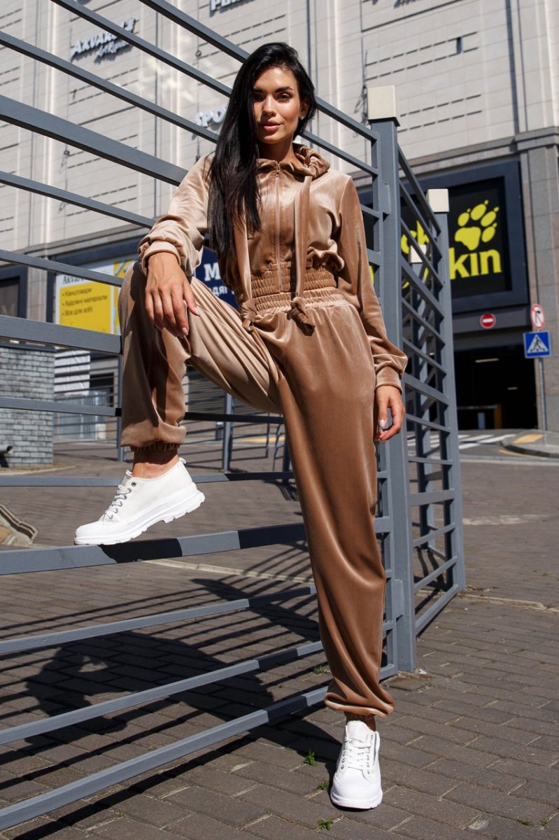 Модный женский костюм с велюром в стиле спорт-шик. Наш новый прогулочный костюм – двойка – отличный выбор на теплую осень! Главным критерием для повседневной одежды остается комфорт. В новой модели Вы будете чувствовать себя удобно и комфортно, ведь это так важно в современном ритме жизни. Модель костюма сочетает в себе свитшот с длинными рукавами с капюшоном и комфортные брюки.