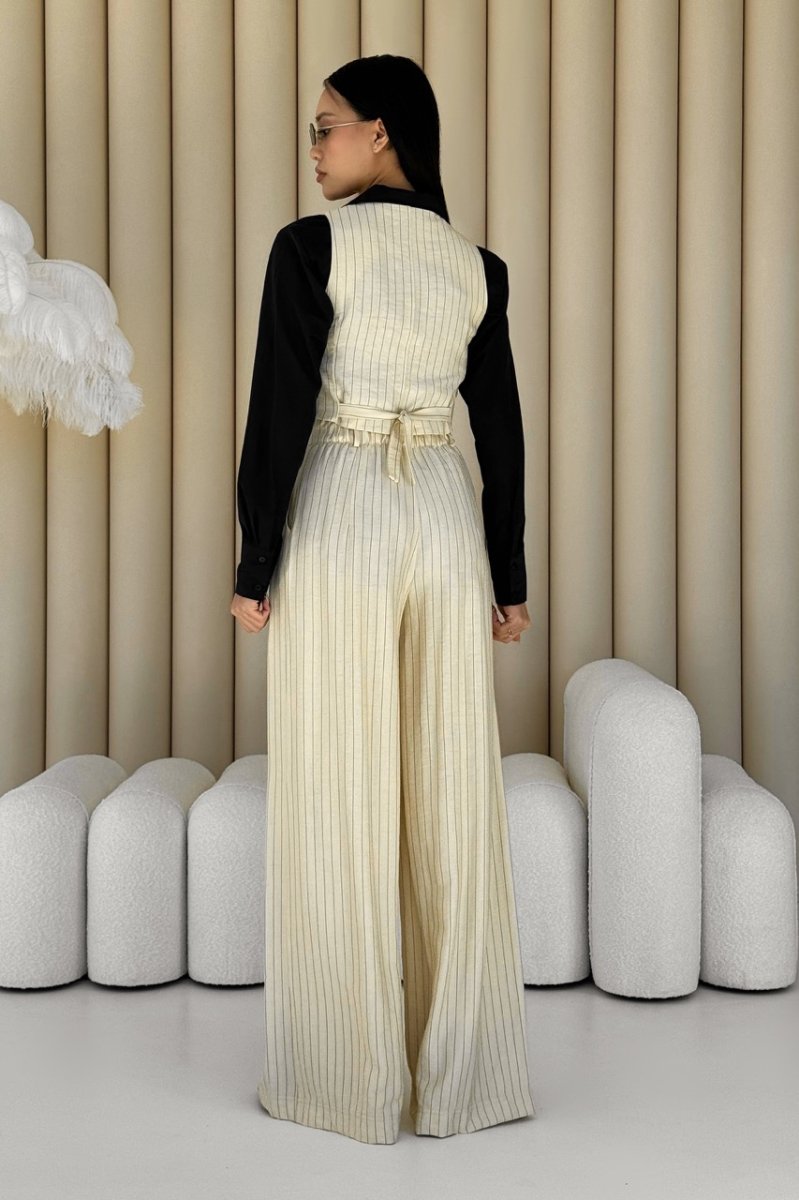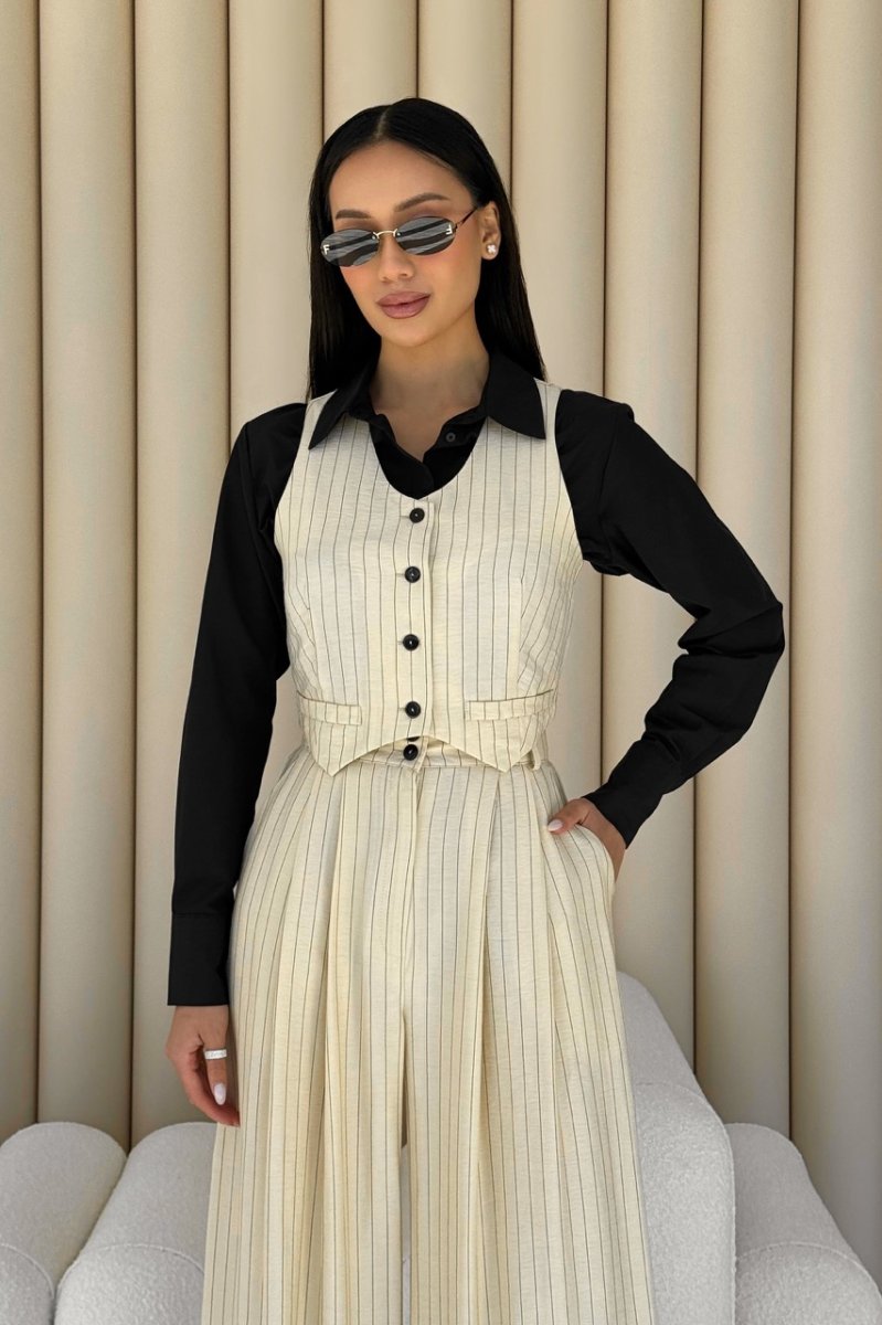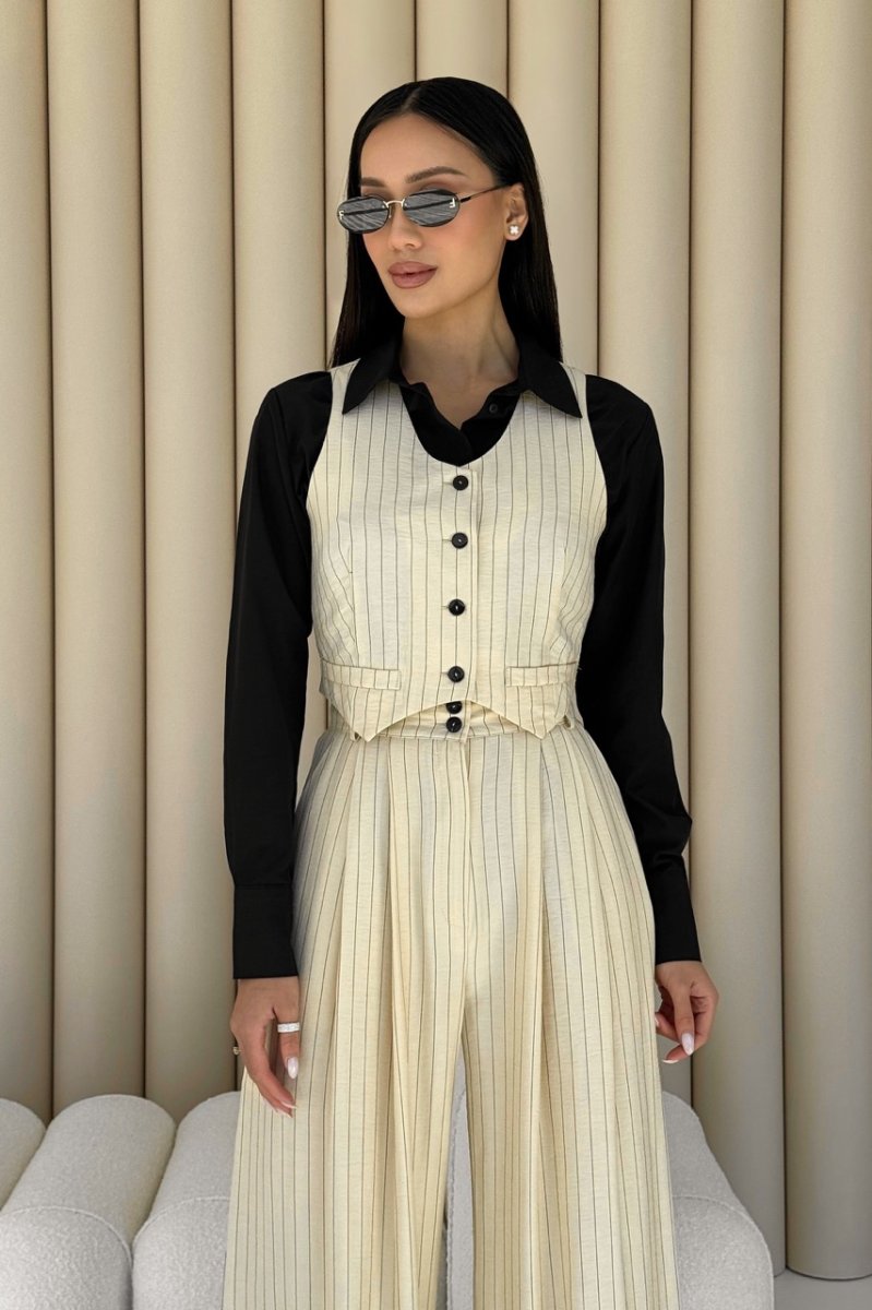 Базовый жилет из костюмной ткани в тонкую полоску – это всегда элегантно и изысканно. Классический крой модели дополнен карманами-обманками. Застегивается жилет на пуговицы спереди, на спинке завязки. Жилет можно носить как самостоятельный элемент образа, так и в комбинации с рубашкой или блузой.