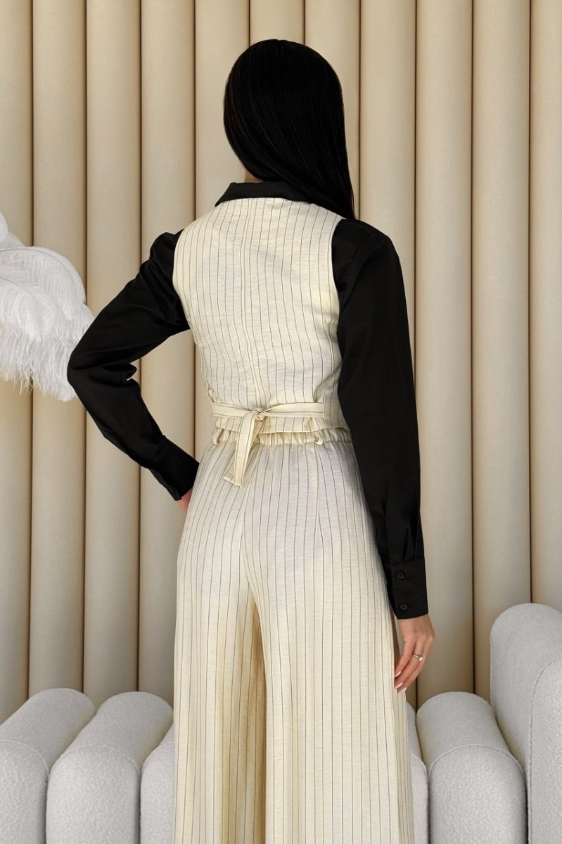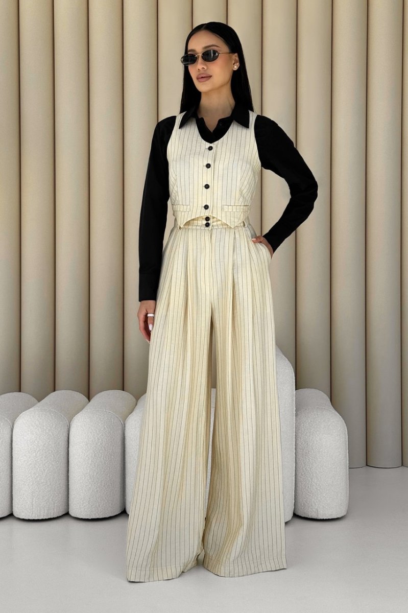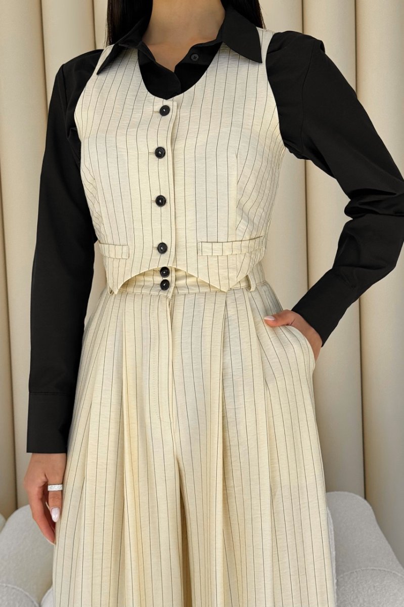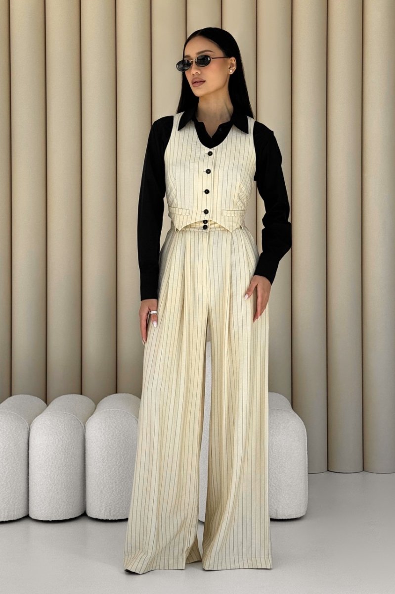Базовый жилет из костюмной ткани в тонкую полоску – это всегда элегантно и изысканно. Классический крой модели дополнен карманами-обманками. Застегивается жилет на пуговицы спереди, на спинке завязки. Жилет можно носить как самостоятельный элемент образа, так и в комбинации с рубашкой или блузой.
