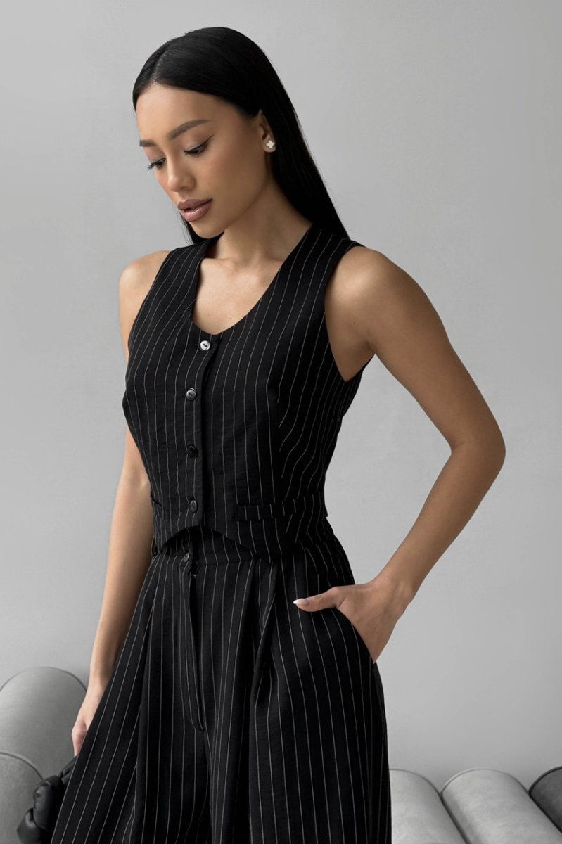 Базовый жилет из костюмной ткани в тонкую полоску – это всегда элегантно и изысканно. Классический крой модели дополнен карманами-обманками. Застегивается жилет на пуговицы спереди, на спинке завязки. Жилет можно носить как самостоятельный элемент образа, так и в комбинации с рубашкой или блузой.