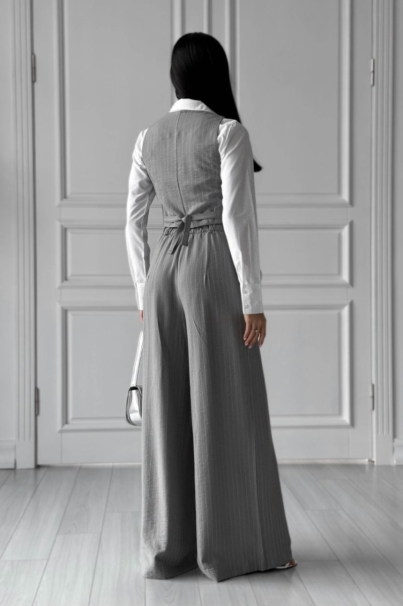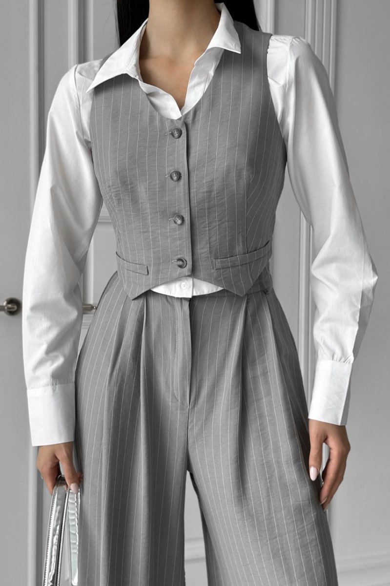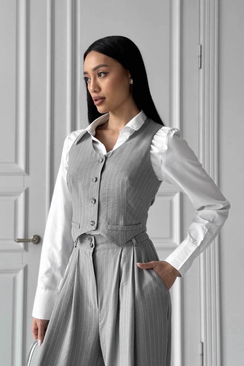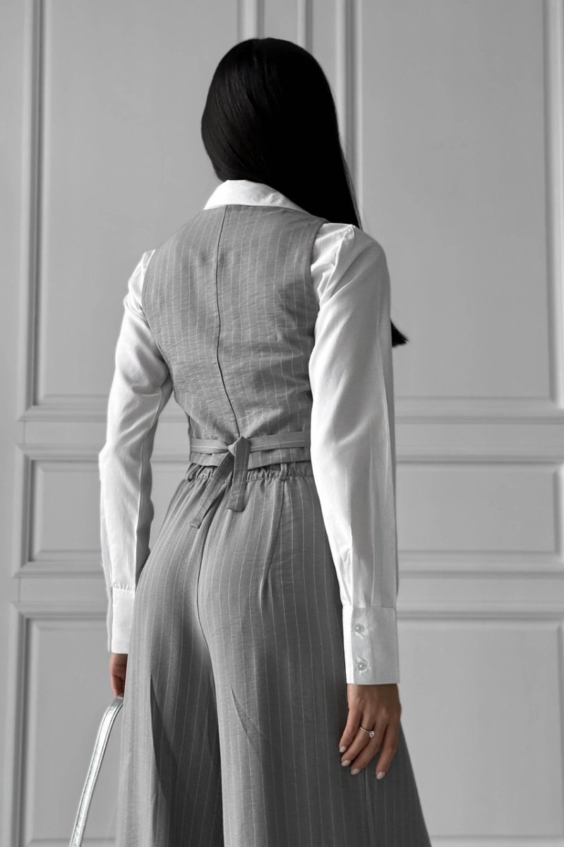 Базовый жилет из костюмной ткани в тонкую полоску – это всегда элегантно и изысканно. Классический крой модели дополнен карманами-обманками. Застегивается жилет на пуговицы спереди, на спинке завязки. Жилет можно носить как самостоятельный элемент образа, так и в комбинации с рубашкой или блузой.