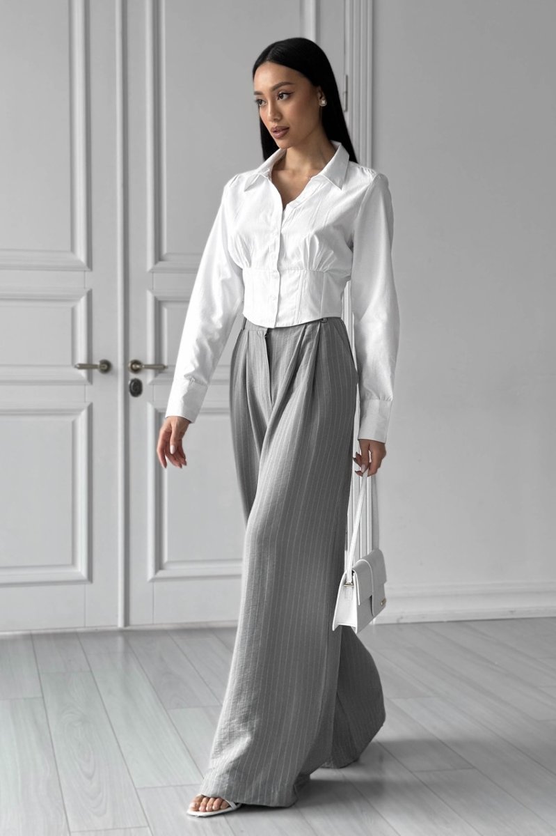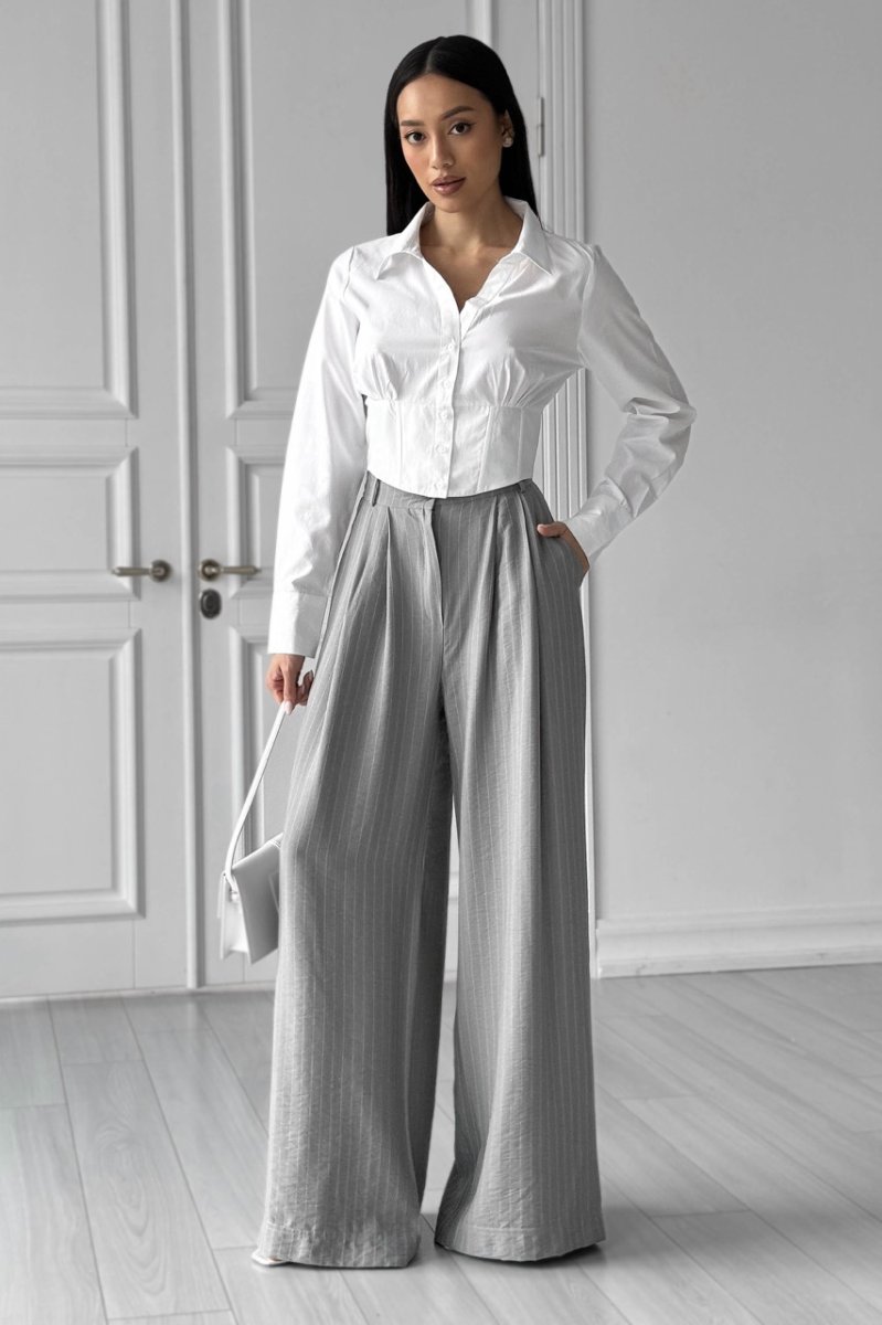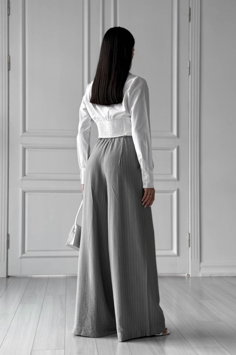 Классические брюки-палаццо прямого кроя, с фиксированными складками по переду. Модель с комфортной посадкой станет базовым элементом для создания повседневного или делового образа. Модель дополнена удобными боковыми карманами. По спинке на талии – резинка, ширина шлевок – 6 см.