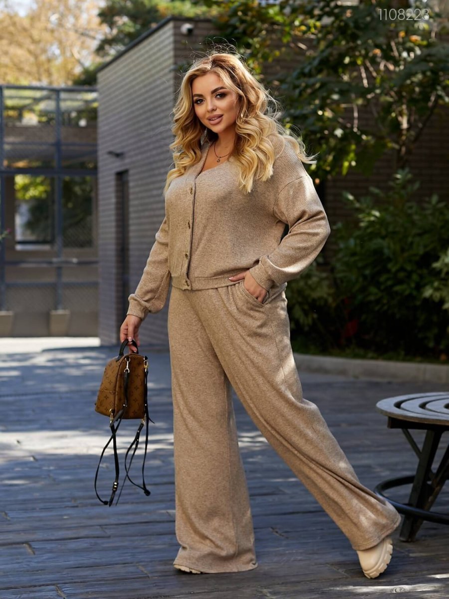 Подробности: Кофта с длинным объемным рукавом, заниженной линией плеча, с застежкой на пуговицы. Роскошные длинные брюки-палаццо с карманами в боковых швах, с поясом на широкой резинке с кулиской.