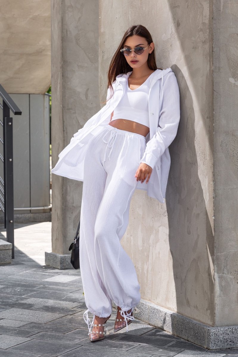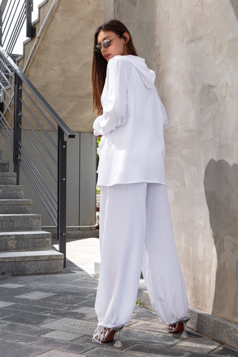 Этот легкий и воздушный костюм – идеальный вариант для женщин, которые любят сочетать комфорт и стиль. Рубашка оверсайз кроя с длинным рукавом и брюки свободного кроя, создающие идеальную посадку на любой фигуре. Рубашка украшена объемными карманами с клапанами и капюшоном с контрастным шнуром.