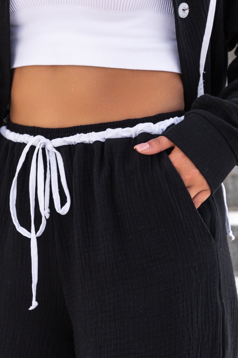 ● Декоративные элементы: отделочная кулиска на талии и шнуры – затяжки по низу брюк