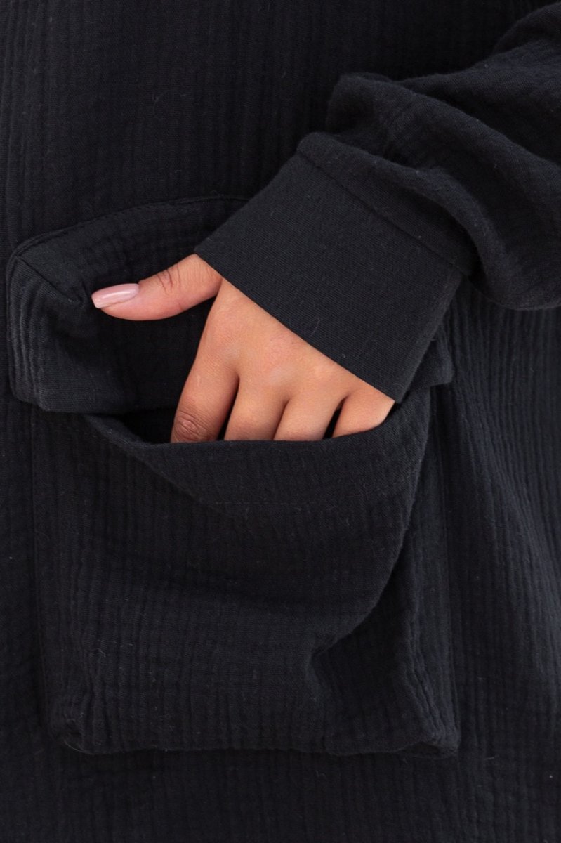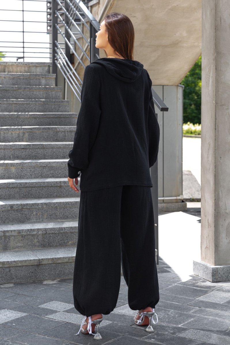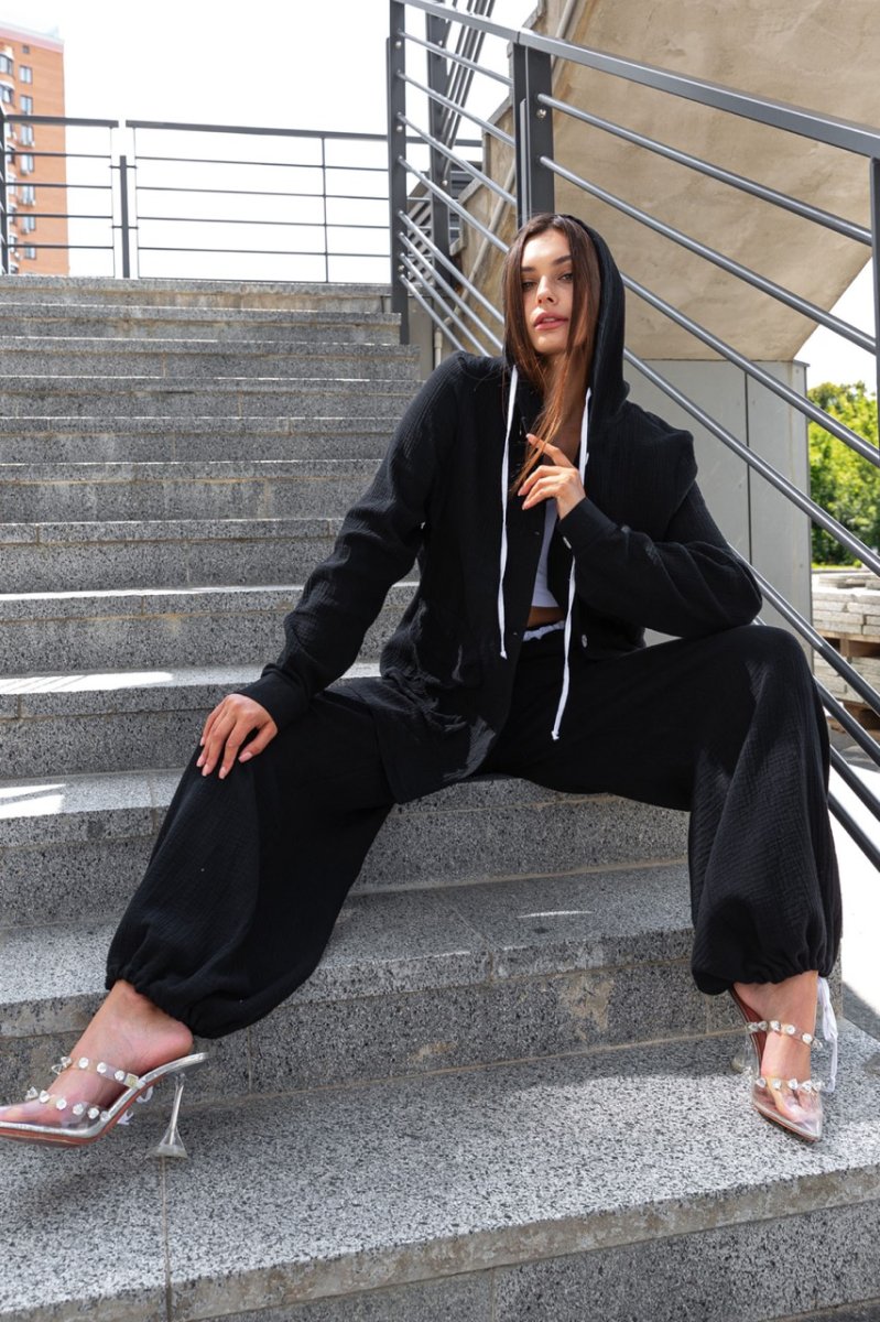 Этот легкий и воздушный костюм – идеальный вариант для женщин, которые любят сочетать комфорт и стиль. Рубашка оверсайз кроя с длинным рукавом и брюки свободного кроя, создающие идеальную посадку на любой фигуре. Рубашка украшена объемными карманами с клапанами и капюшоном с контрастным шнуром.