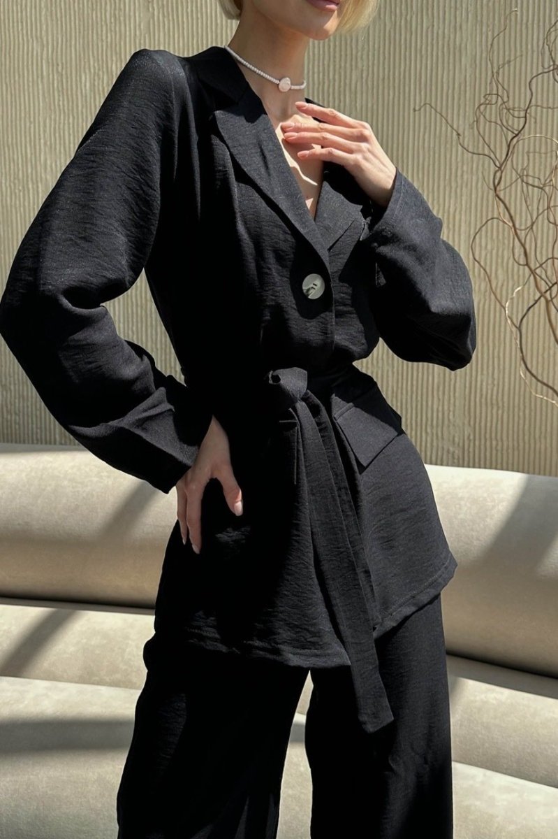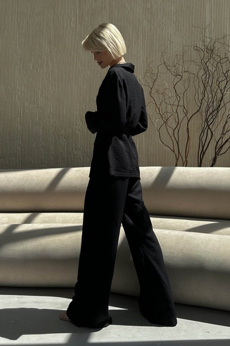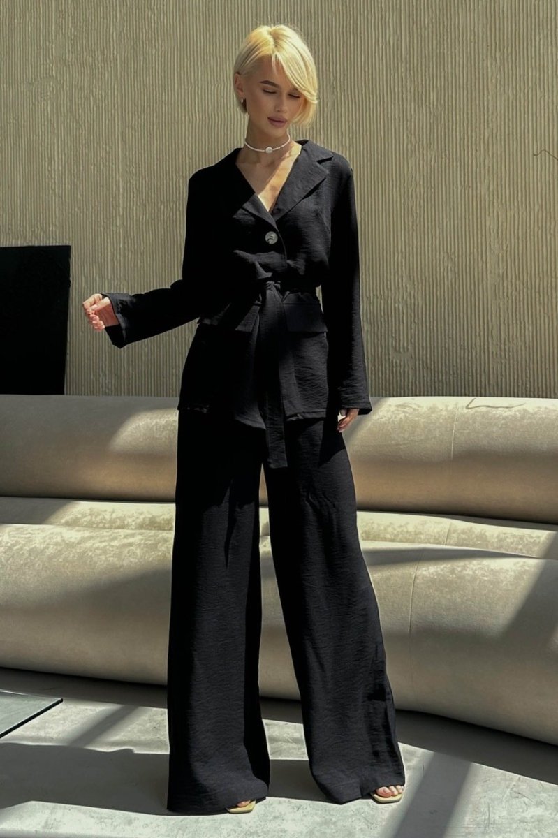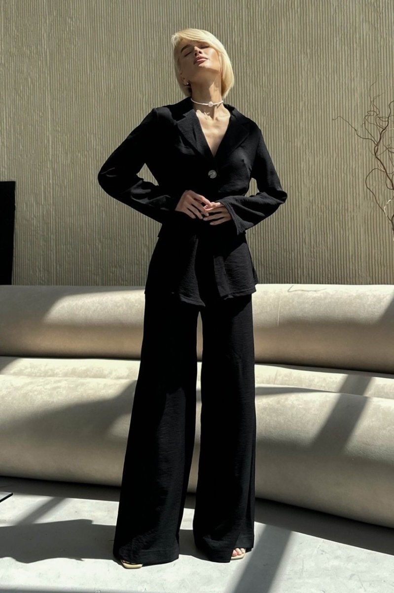 Пиджак с лацканами прямого кроя в комплекте с трендовыми штанами палаццо – отлично подойдет на жаркое лето.