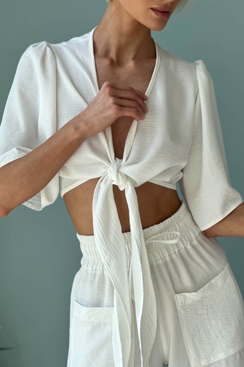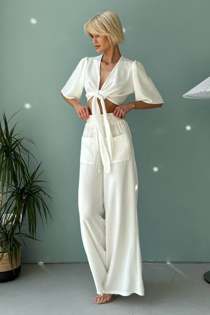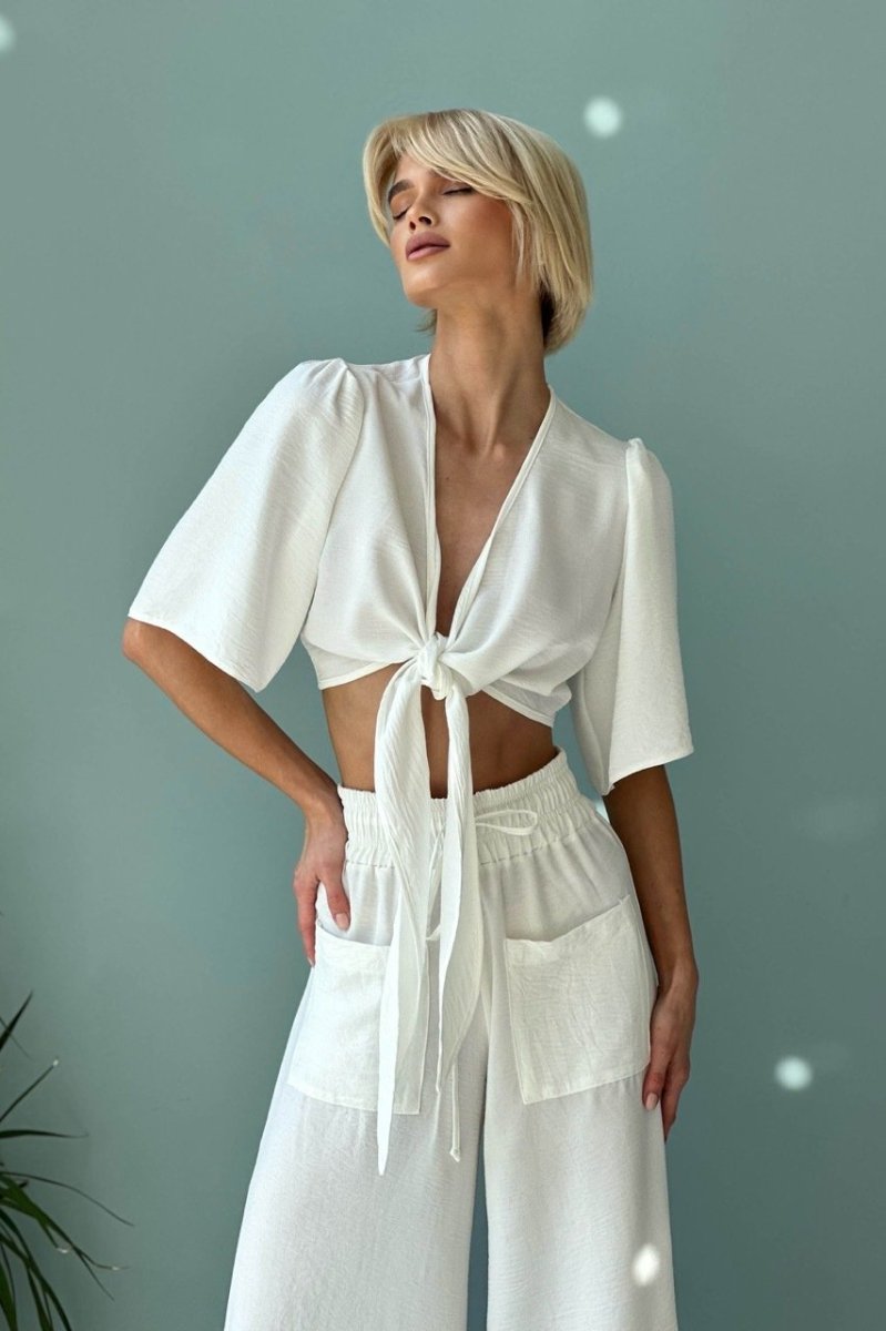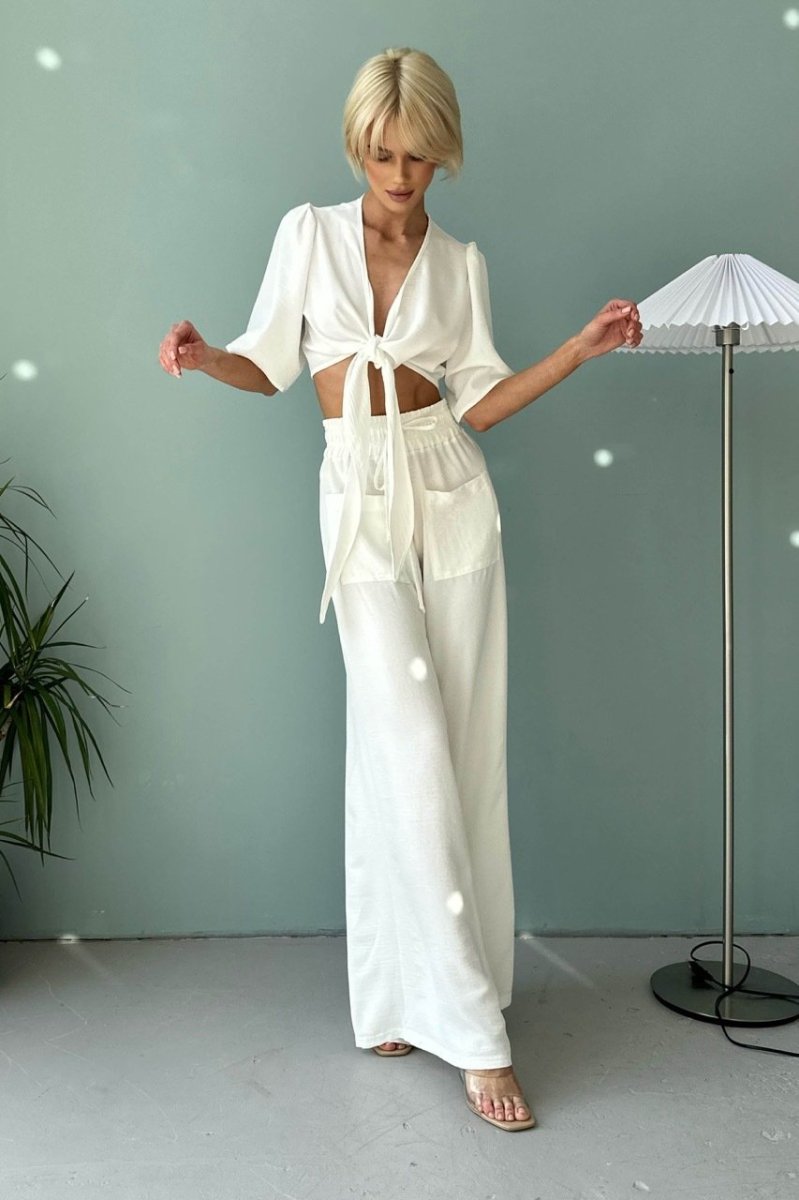 Практичный костюм с топом на завязках и глубоким декольте задает настроение всему образу. Костюм выполнен из легкого американского крепа. Топ с короткими рукавами. Брюки свободного кроя с эластичной вставкой в талии.