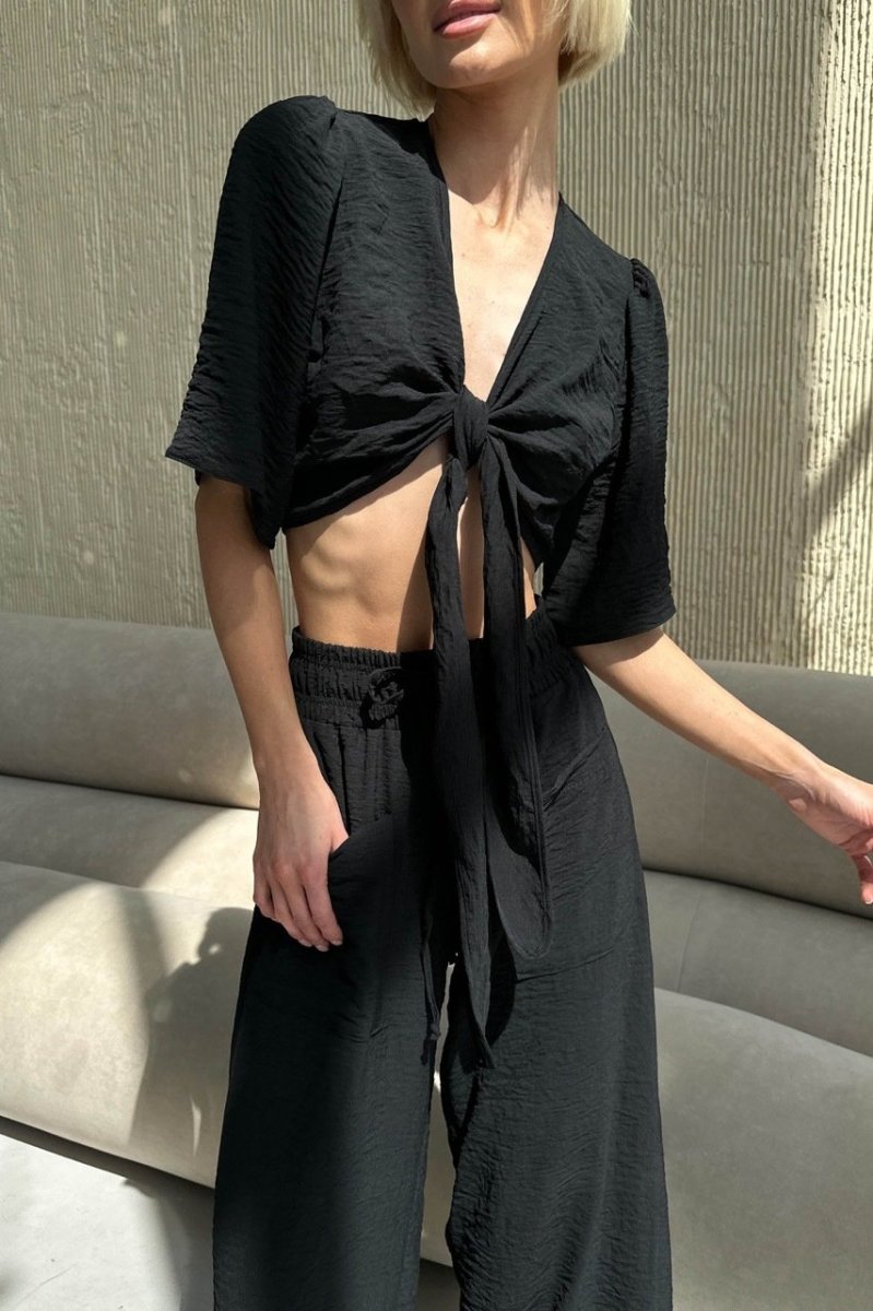 Практичный костюм с топом на завязках и глубоким декольте задает настроение всему образу. Костюм выполнен из легкого американского крепа. Топ с короткими рукавами. Брюки свободного кроя с эластичной вставкой в талии.