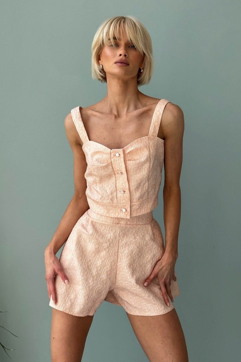 Универсальный летний комплект – топ и шорты из жаккарда. Комплект отлично подойдет для вечерней прогулки или отдыха за городом. Такой костюм можно удачно комбинировать с разными элементами одежды, а значит, всегда оставаться в центре внимания и ловить тысячи комплиментов!