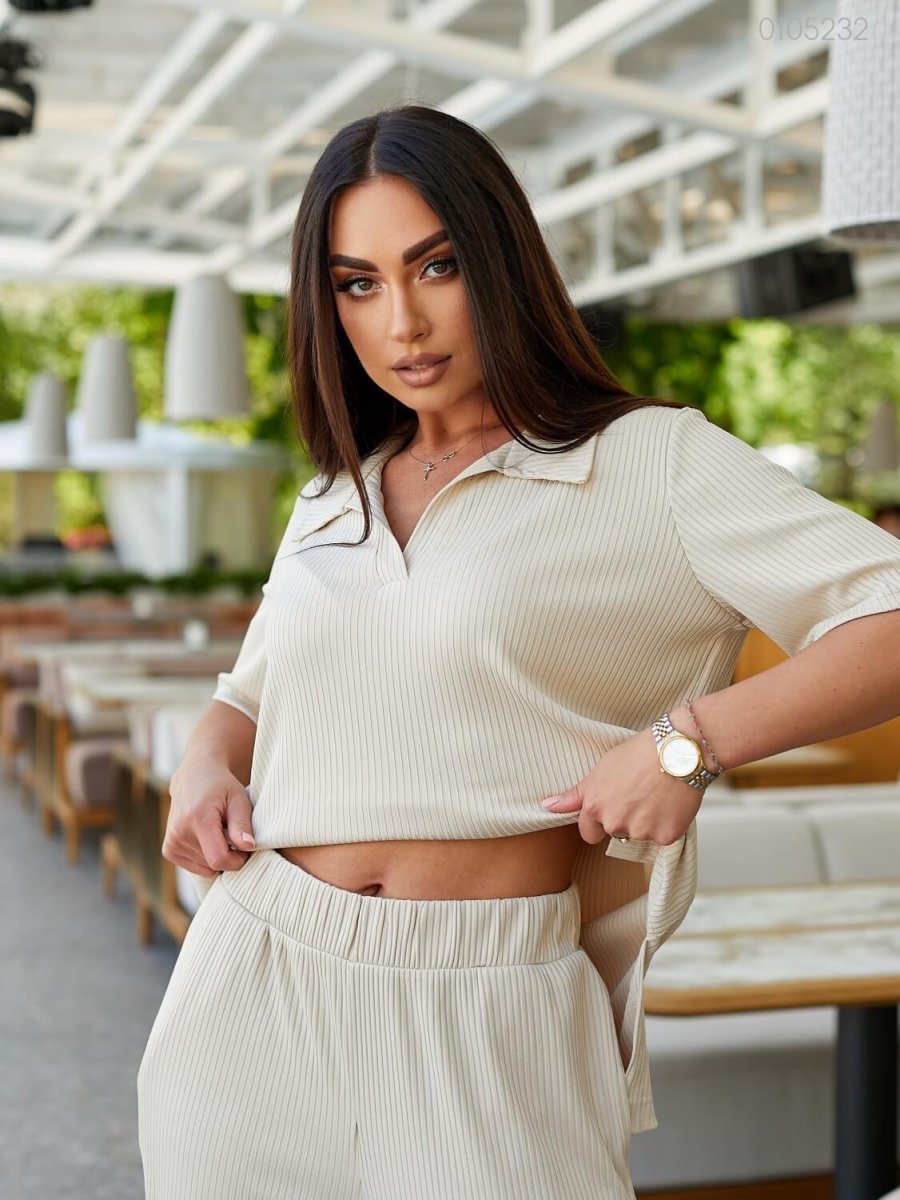 Костюм с удлиненной футболкой-поло свободного кроя (бежевый)