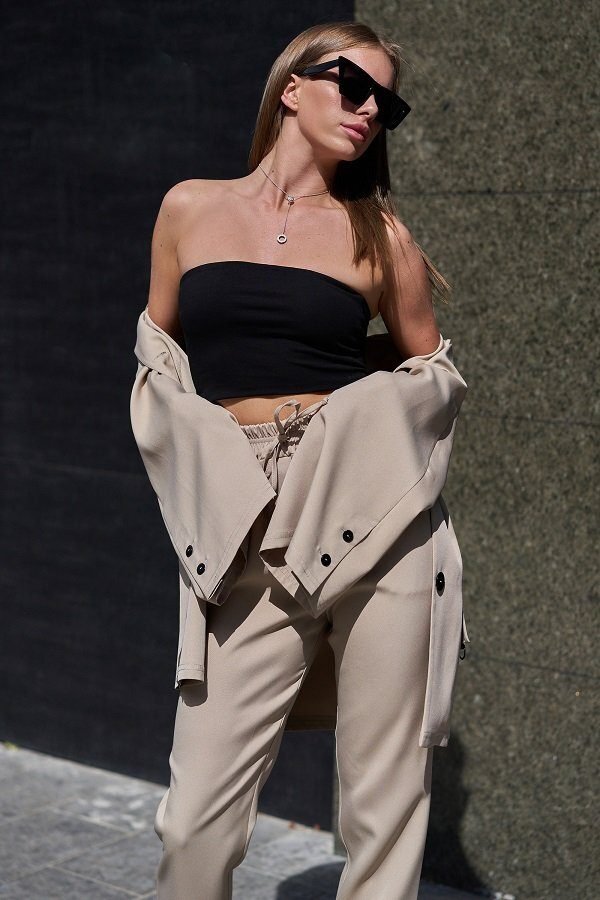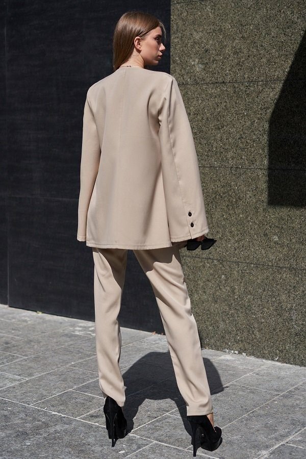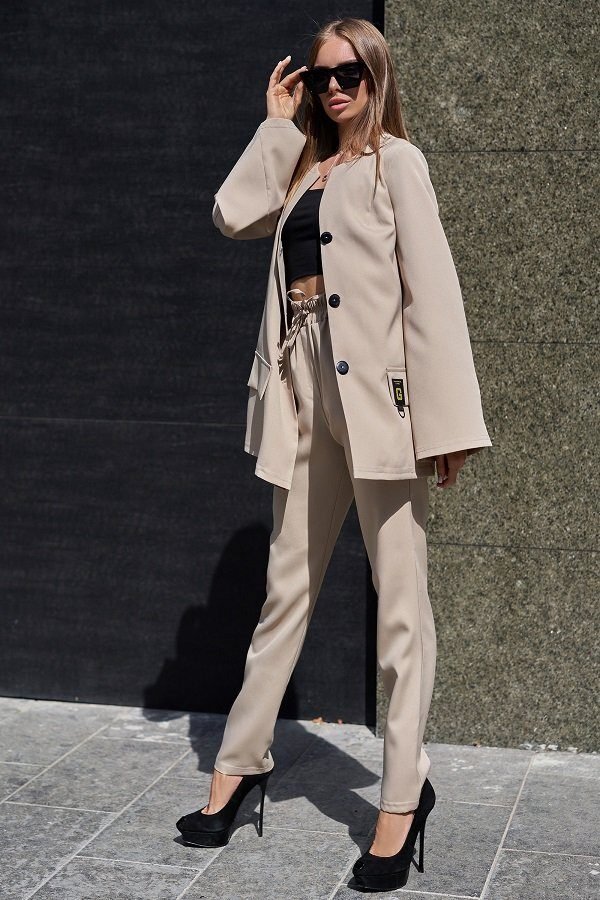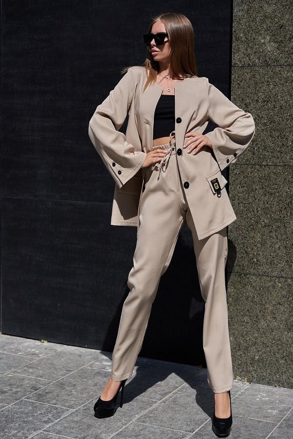 Классический брючный костюм – двойка на основе двубортного жакета и брюк прямого кроя – по праву считается самым практичным и изысканным предметом женского гардероба. Элегантная модель брючного костюма прекрасно послужит для составления модных уличных луков, практичных повседневных аутфитов и романтичных ансамблей. В зависимости от выбранного стиля, подбирается модель определенного формата, которая заметно преображает и влияет на восприятие Вашего образа. Изысканный крой жакета делает акценты на груди, талии, визуально стройнит. Практичные брюки с прорезными карманами на широкой резинке со шнурком – добавят Вашему образу стиля!